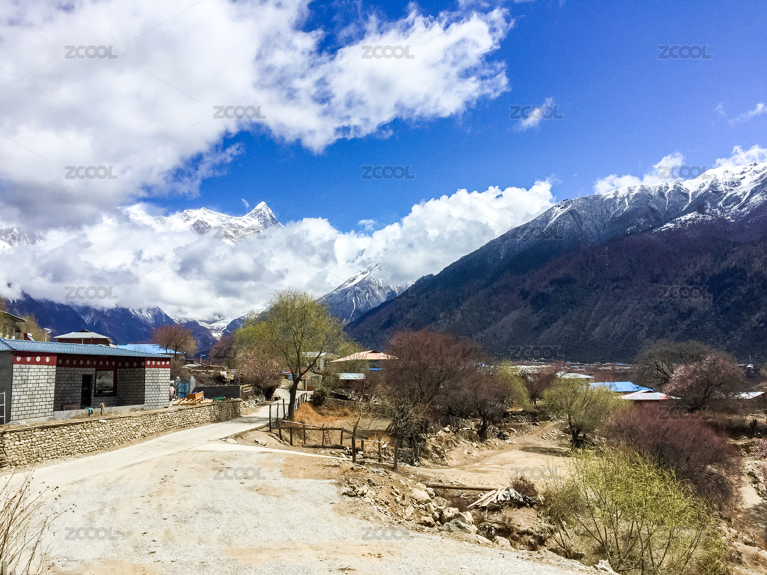 中国西藏林芝工布江达县帮达村雪山乡村风光