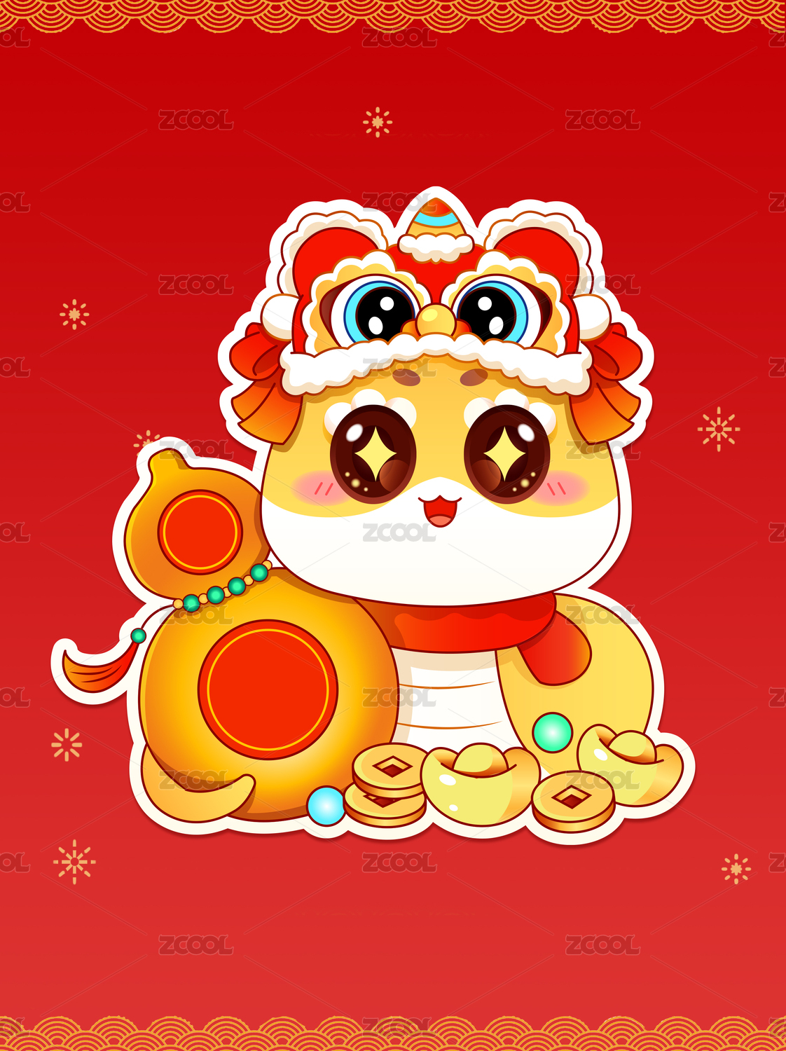 蛇年春节新年可爱卡通形象福禄元宝插画海报