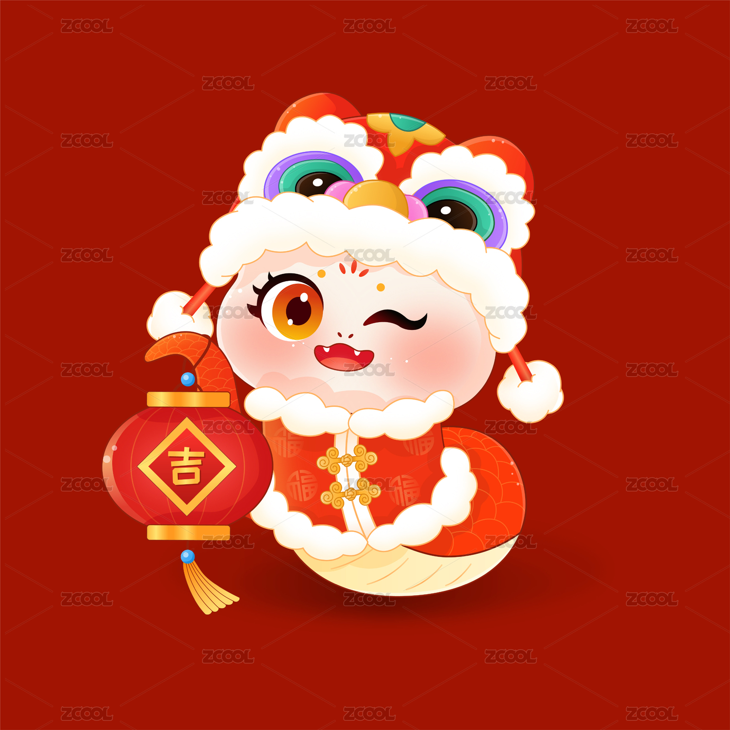 蛇年春节新年可爱卡通形象灯笼红包插画海报