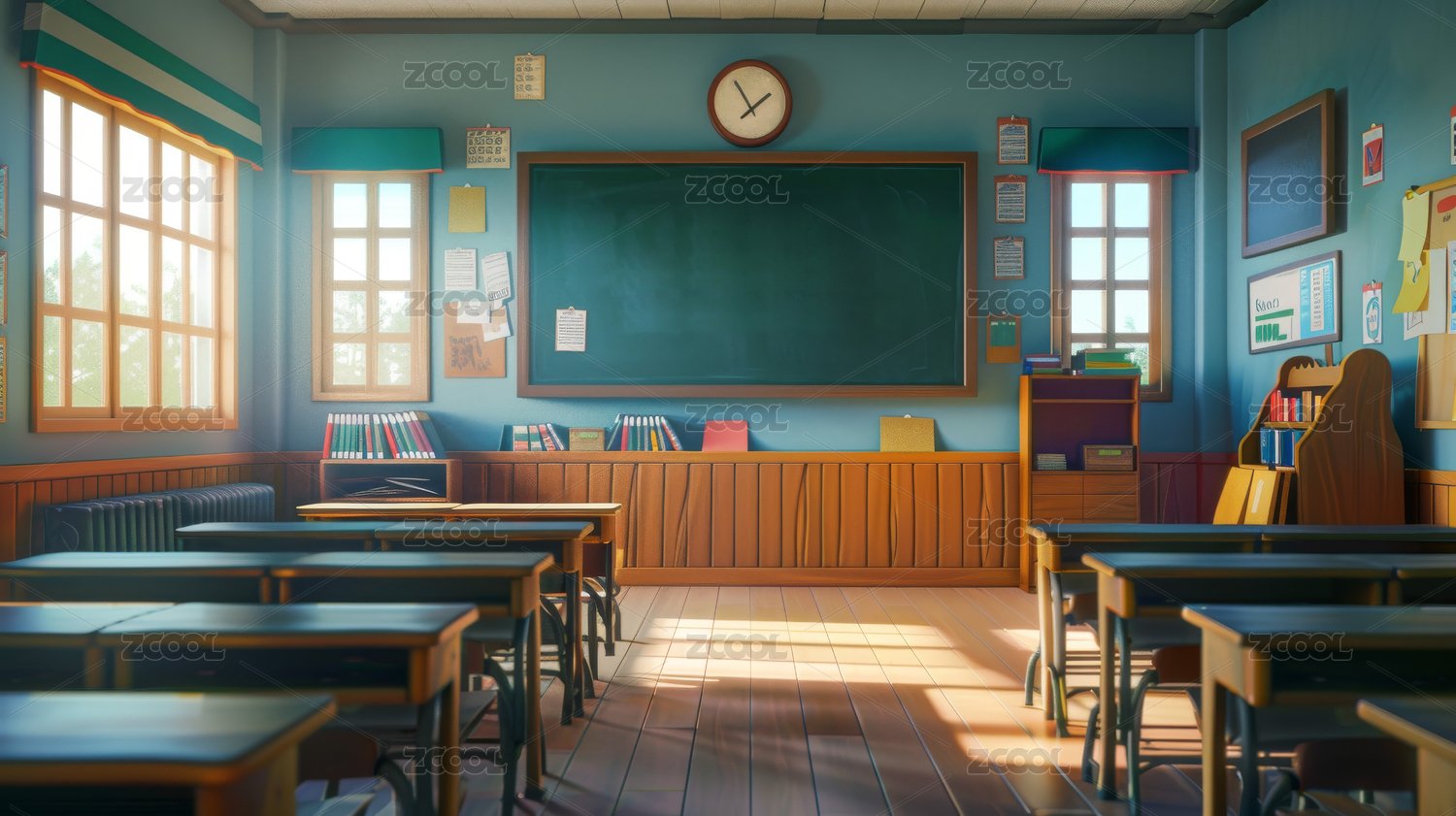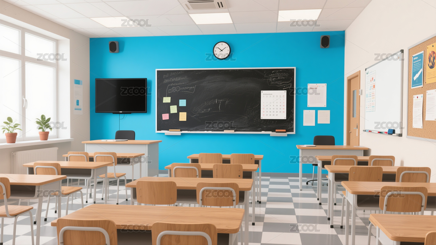 蓝色墙壁的教室中有桌椅黑板电视和时钟