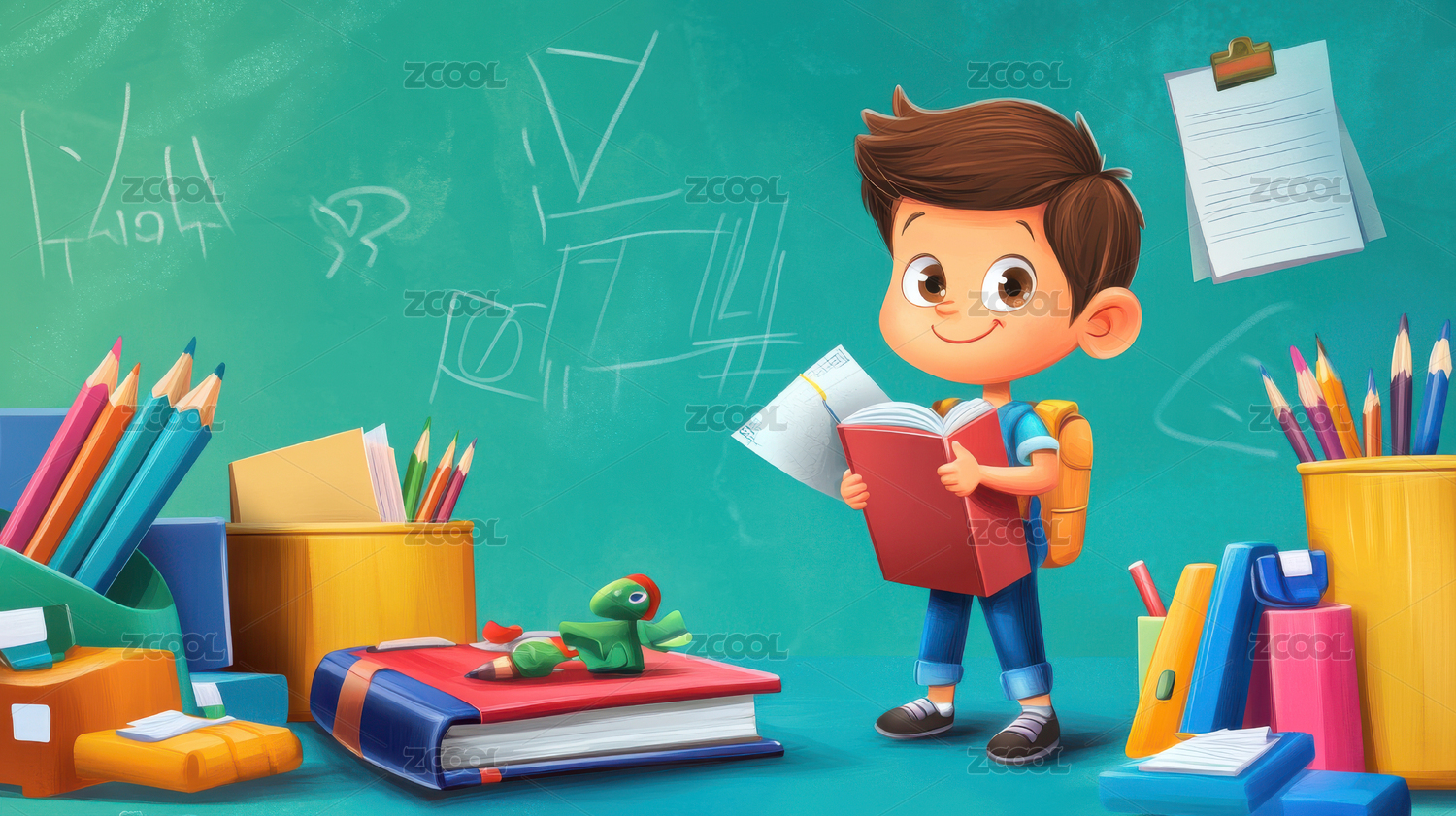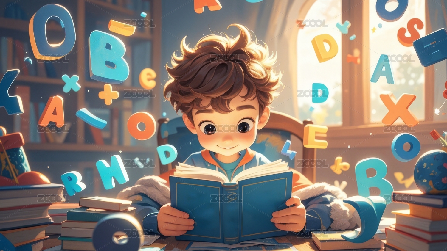 一个可爱小孩正在看书的3D背景插画