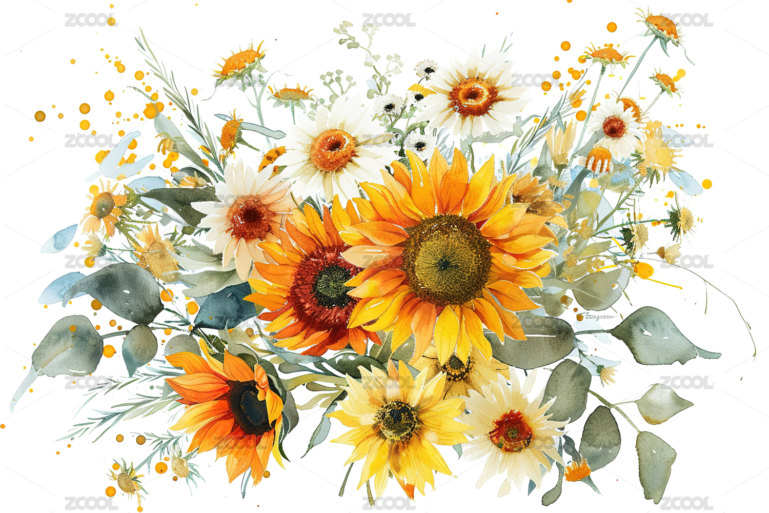 向日葵与多种花卉构成的艺术插图