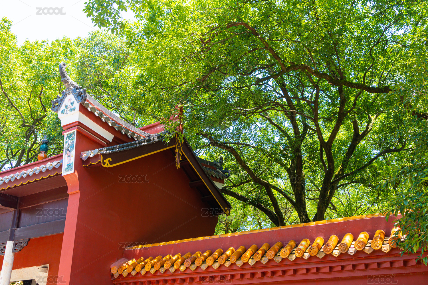 中式传统建筑宁静的红墙琉璃瓦长廊