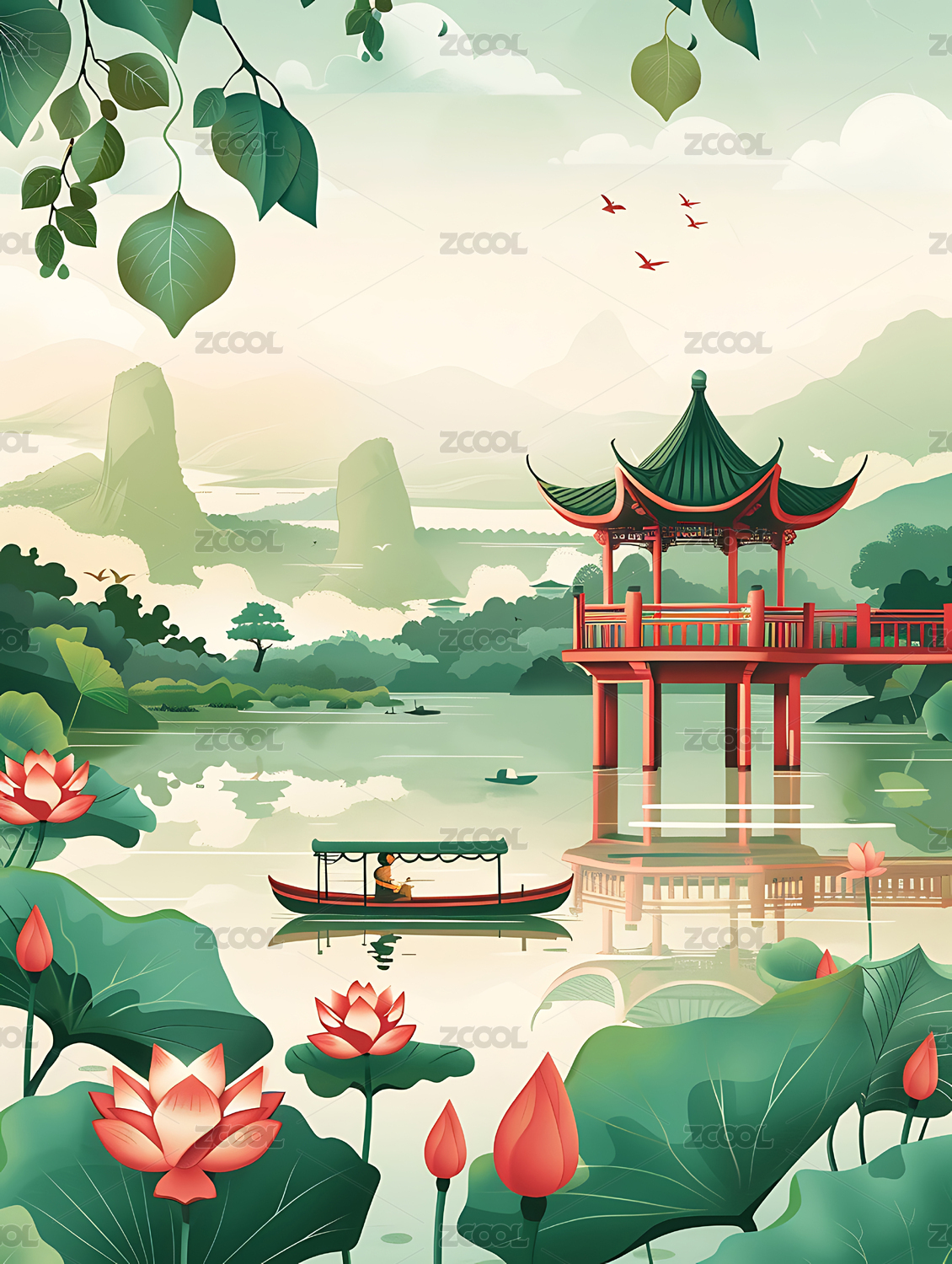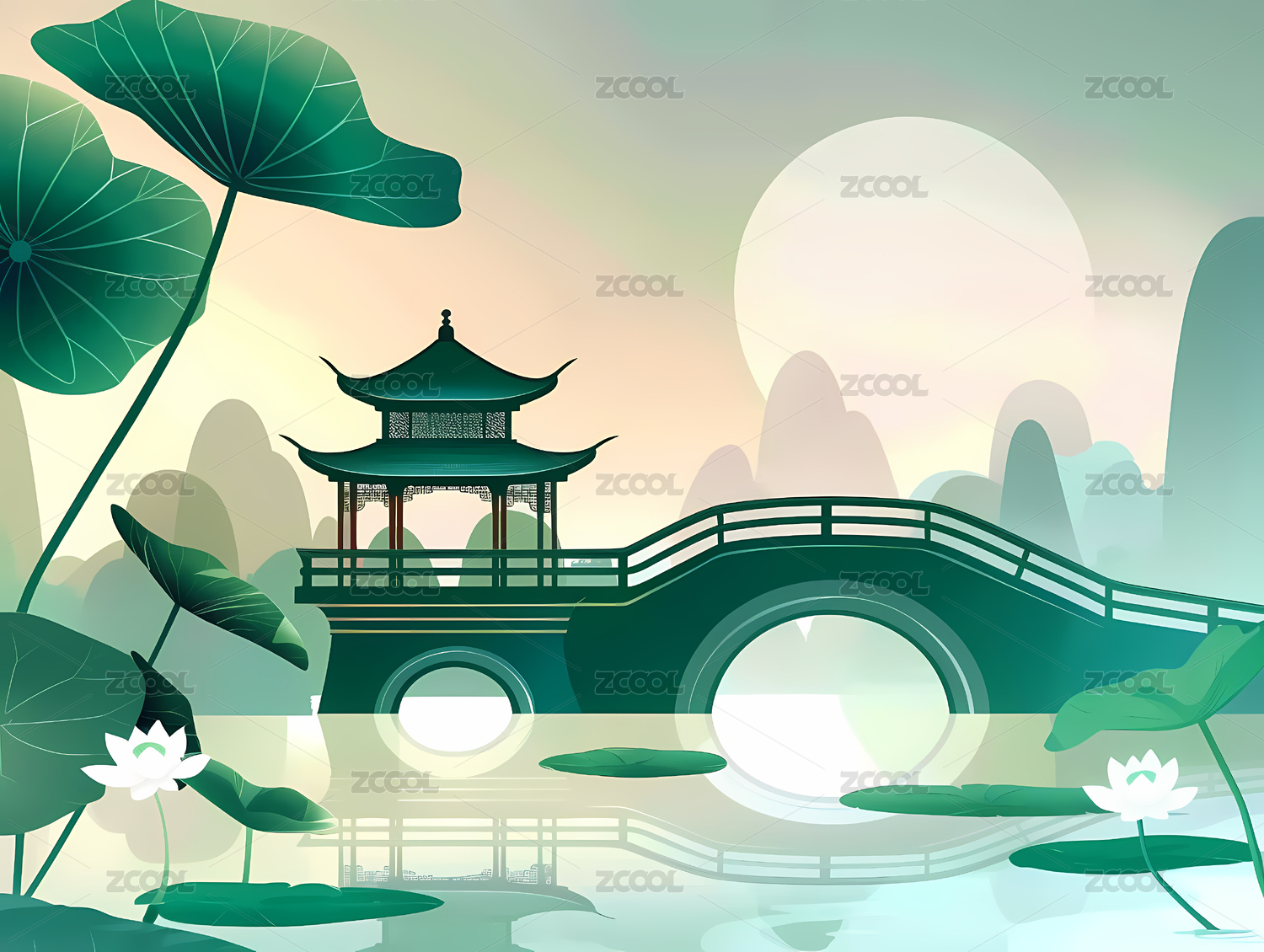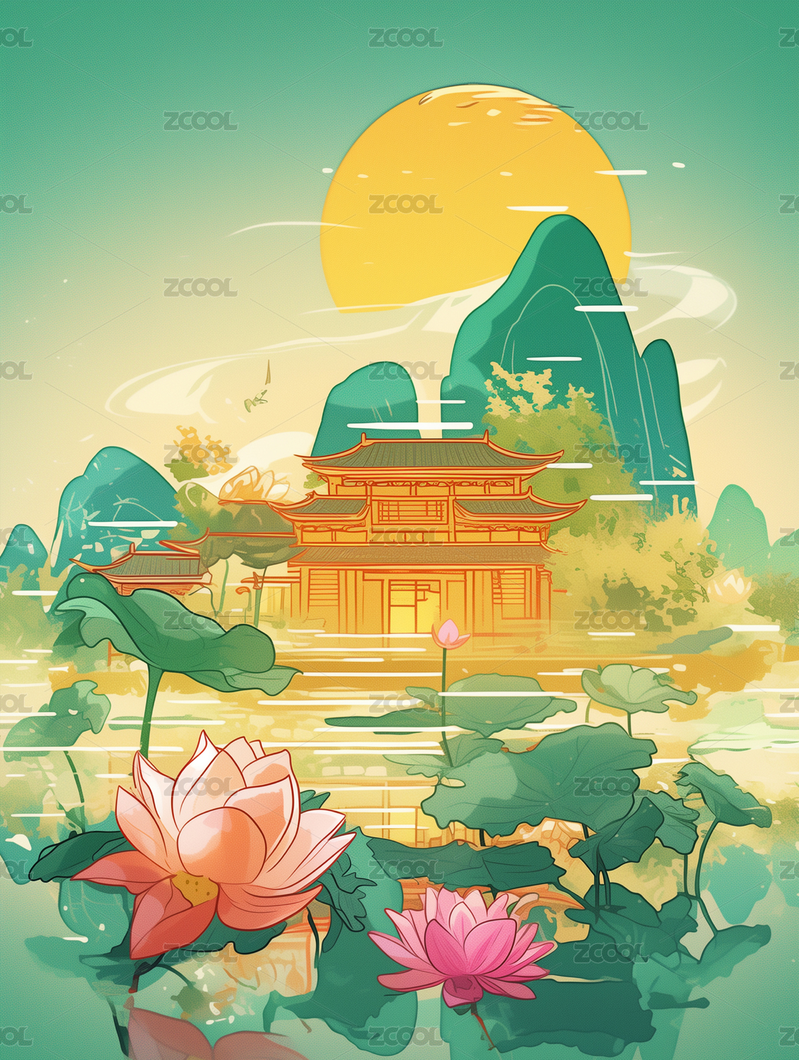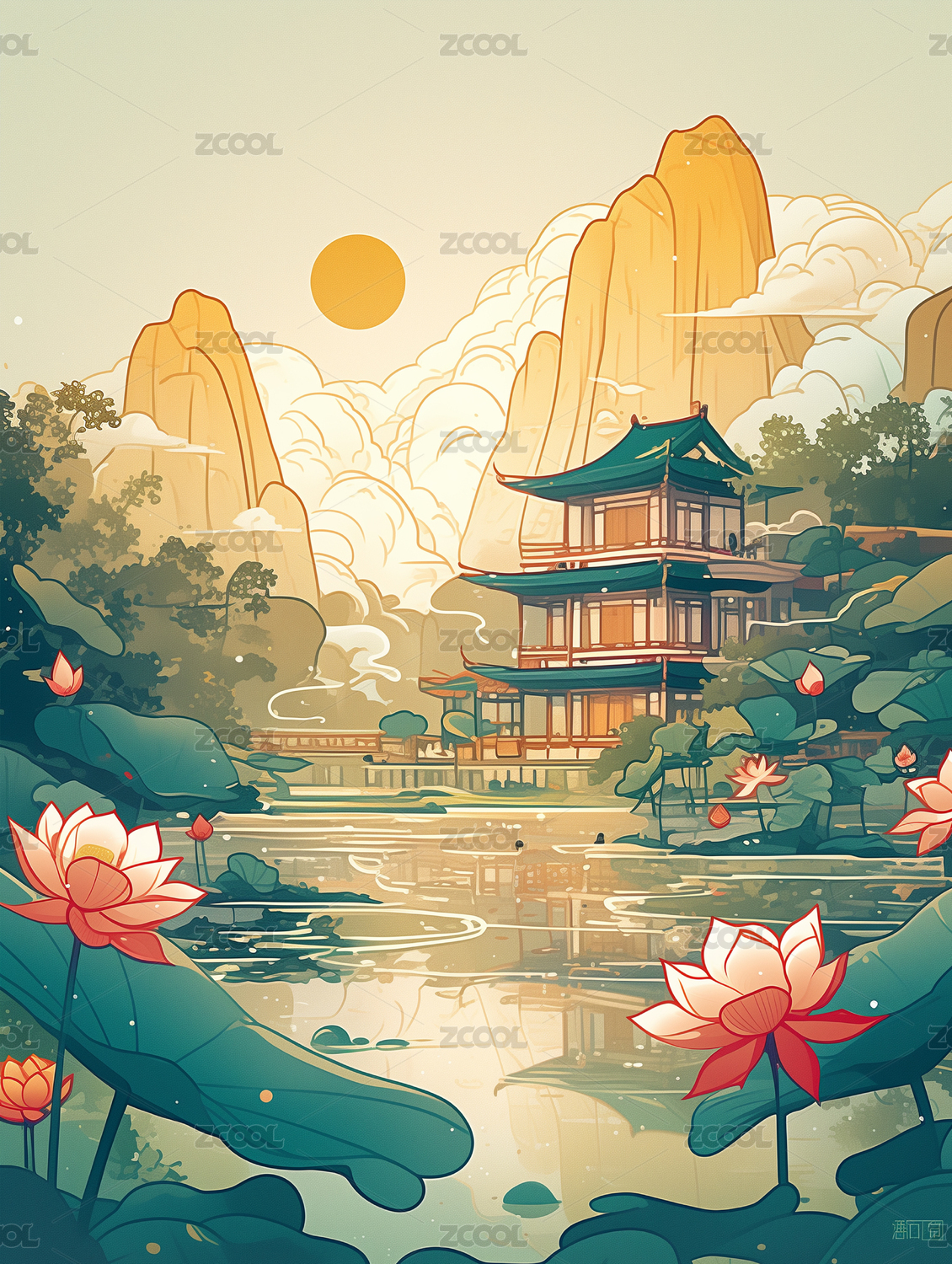 AIGCFG,荷花,夕阳,日出,山川,溪流,荷叶,国潮,手绘,古建