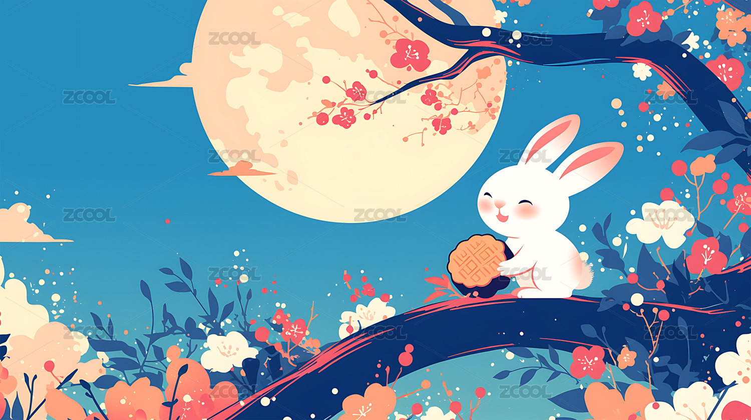 AIGC202403,玉兔,月亮,月饼,兔子,兔,插画,背景,卡通,扁平