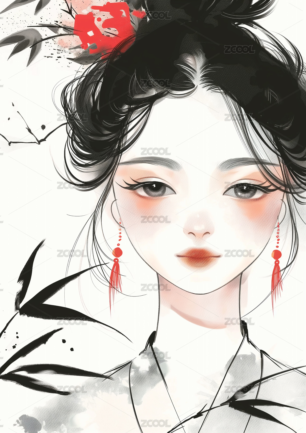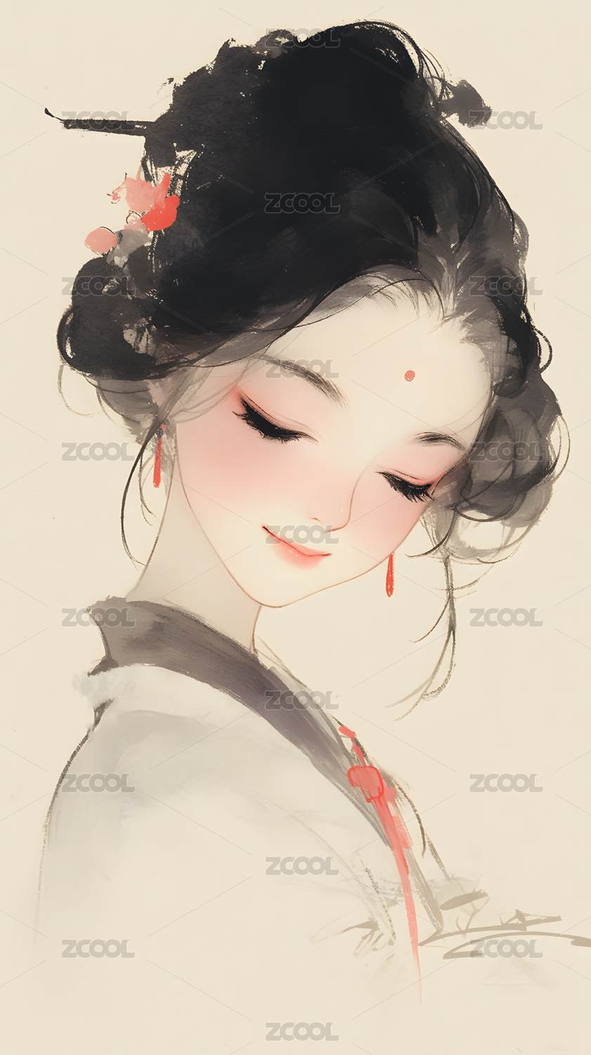 水墨风格婉约少女插画