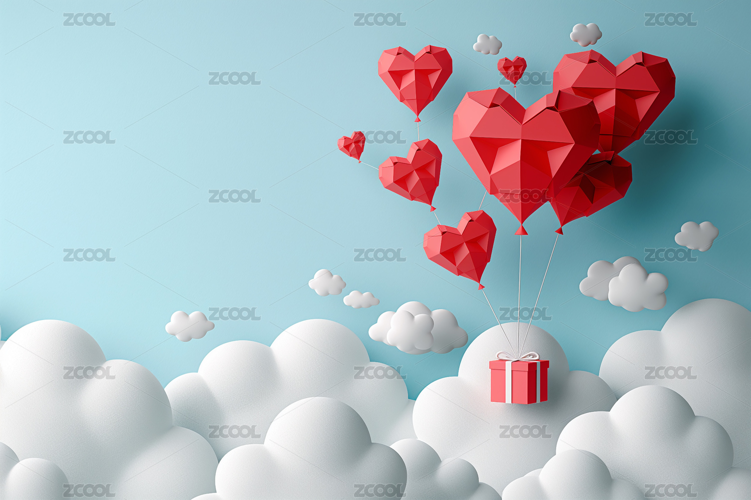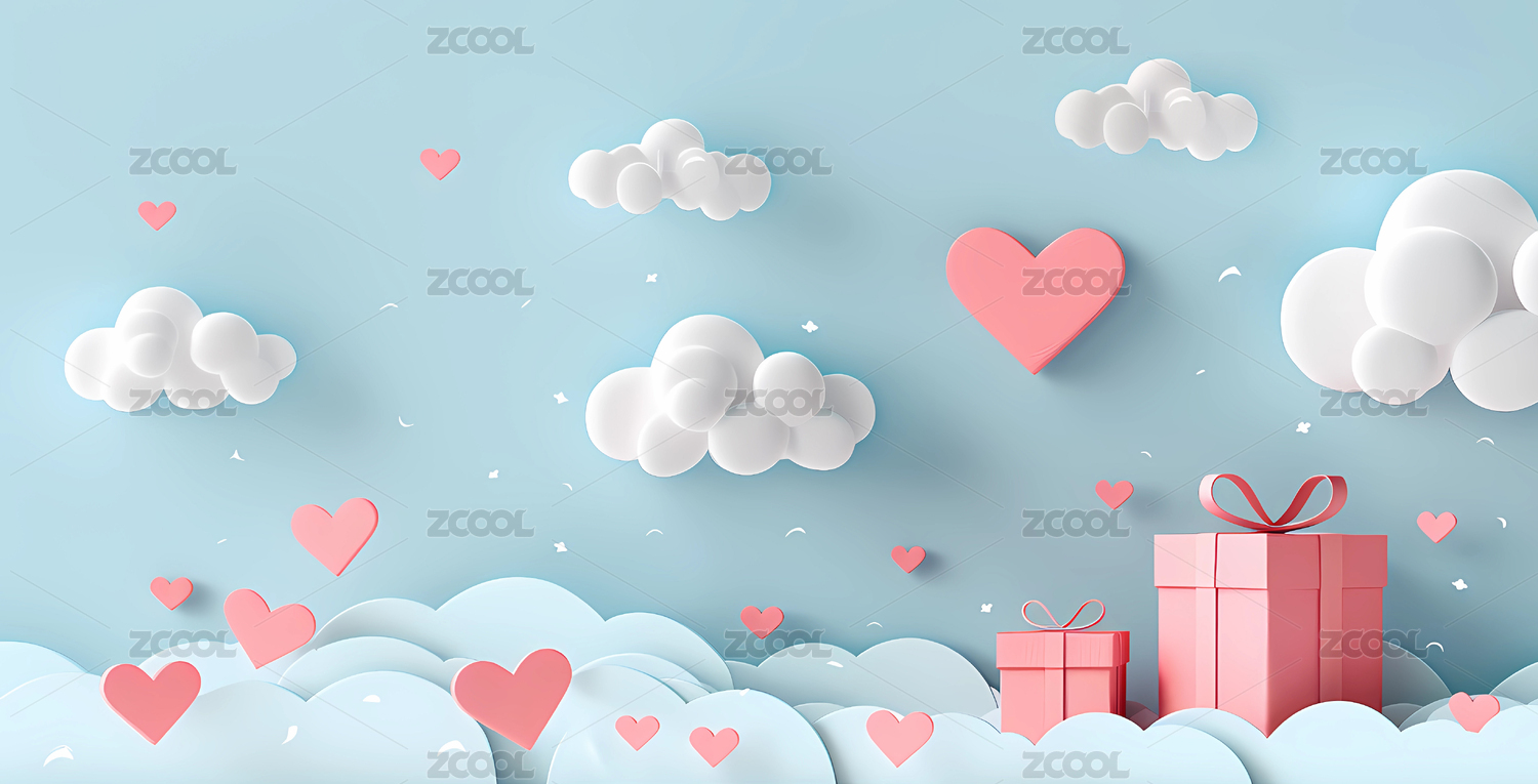 情人节七夕3D卡通心形气球剪纸风礼盒背景