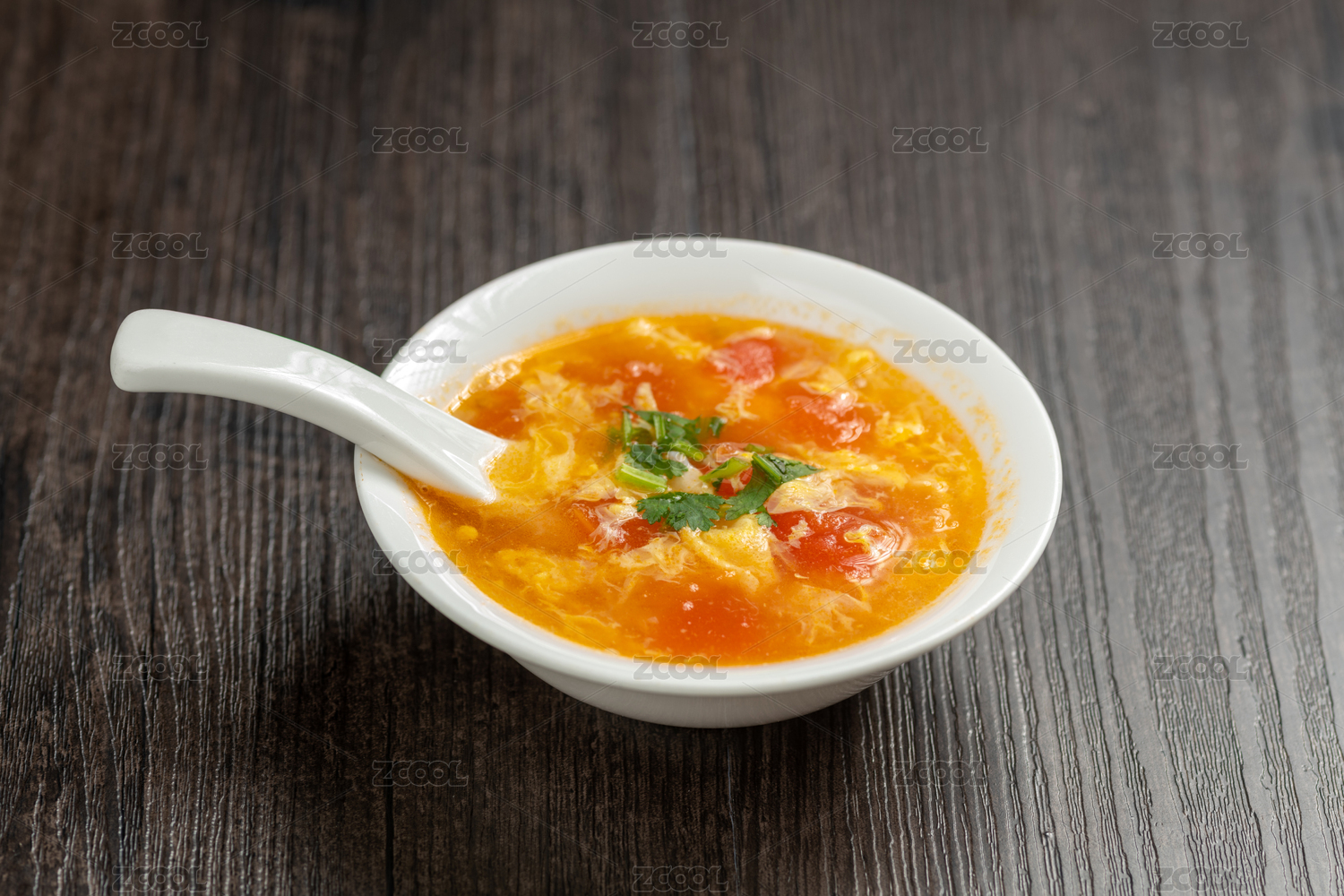 一碗番茄鸡蛋汤摆放在木桌面上特写