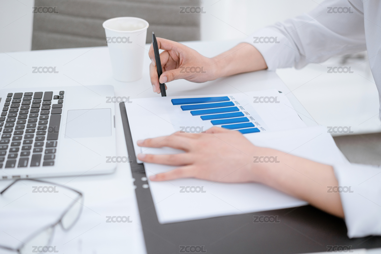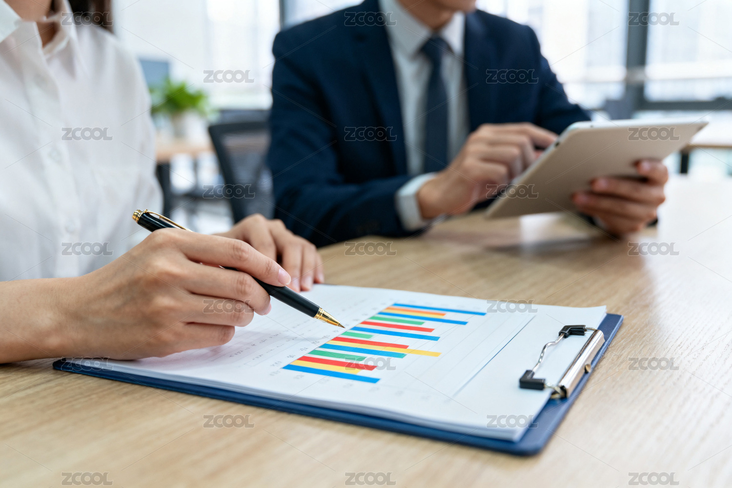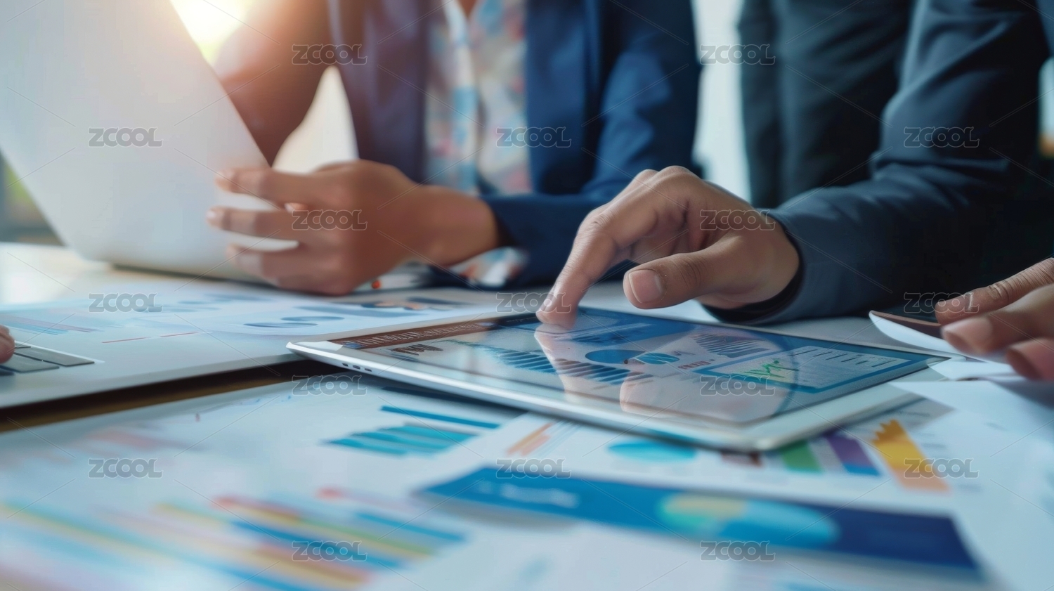 具有会议,讨论规划和移动数字平板电脑上指向图形图像专业商务人士的特写照片。
