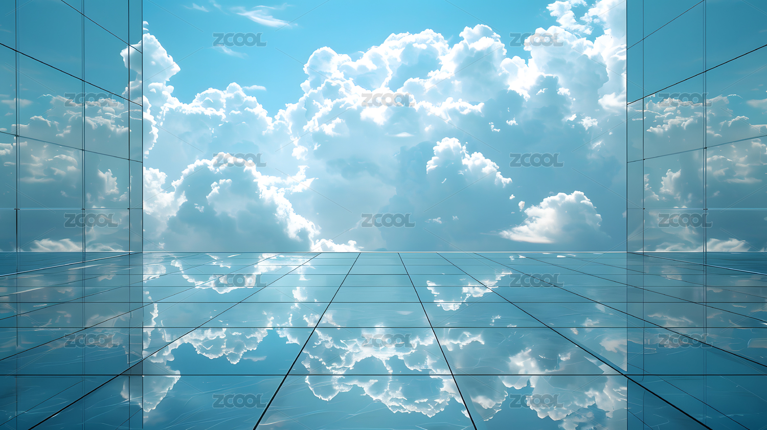 房子淡蓝色瓷砖走廊天空云朵3D插画