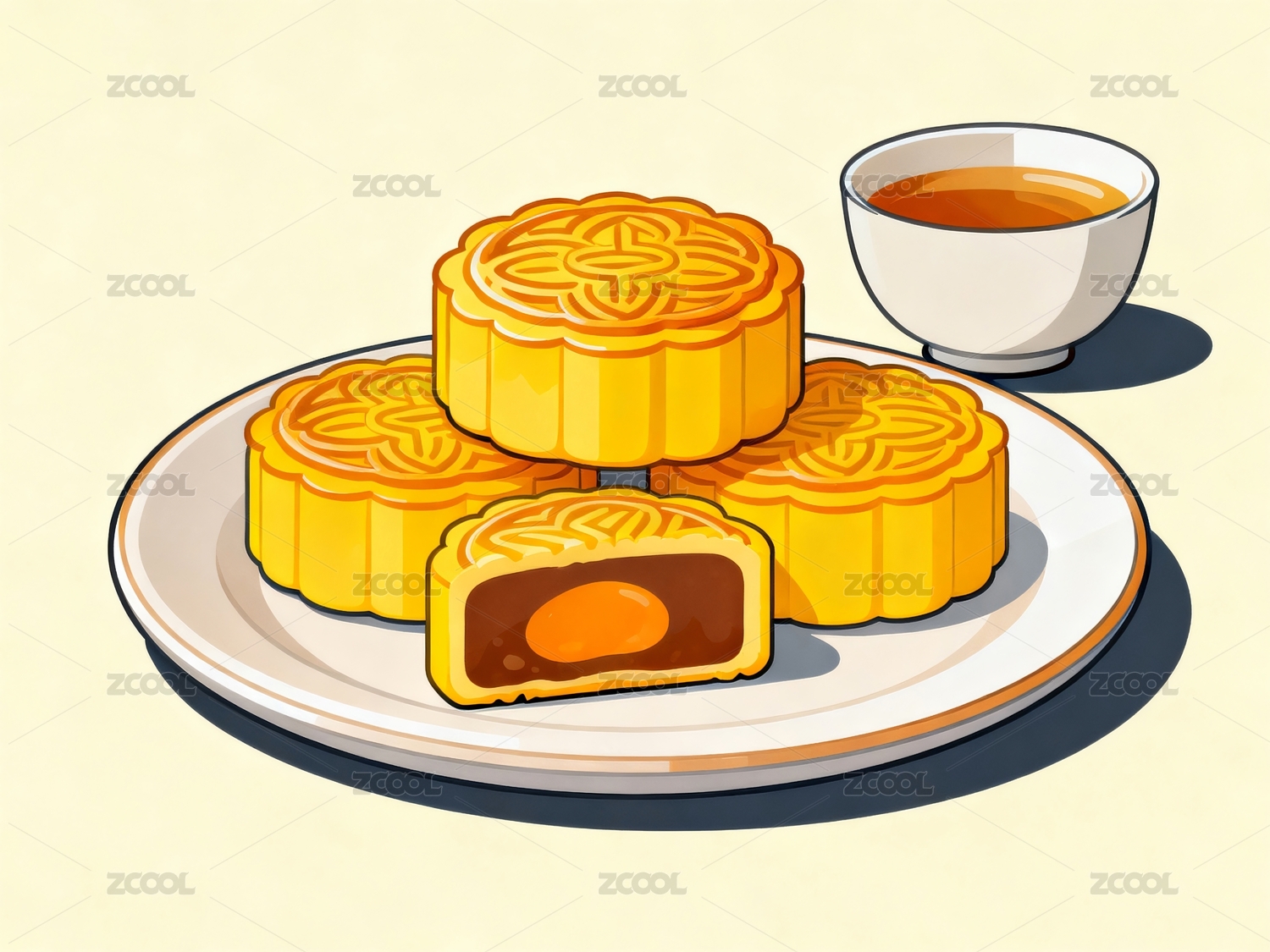木盘上摆放着用月饼茶壶桂花,手绘中国风插画