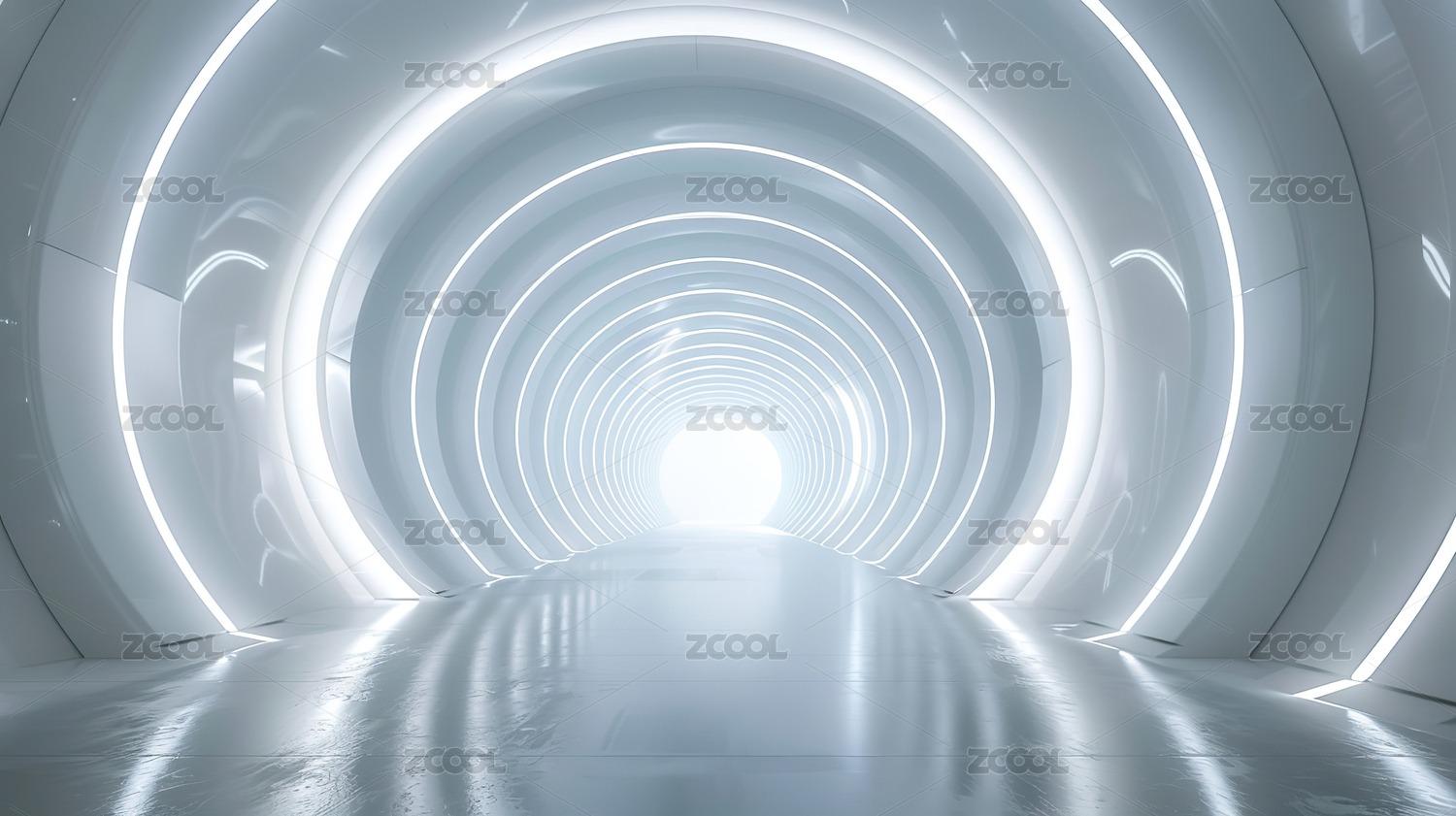 白色未来科技隧道:充满对称美学和霓虹灯光