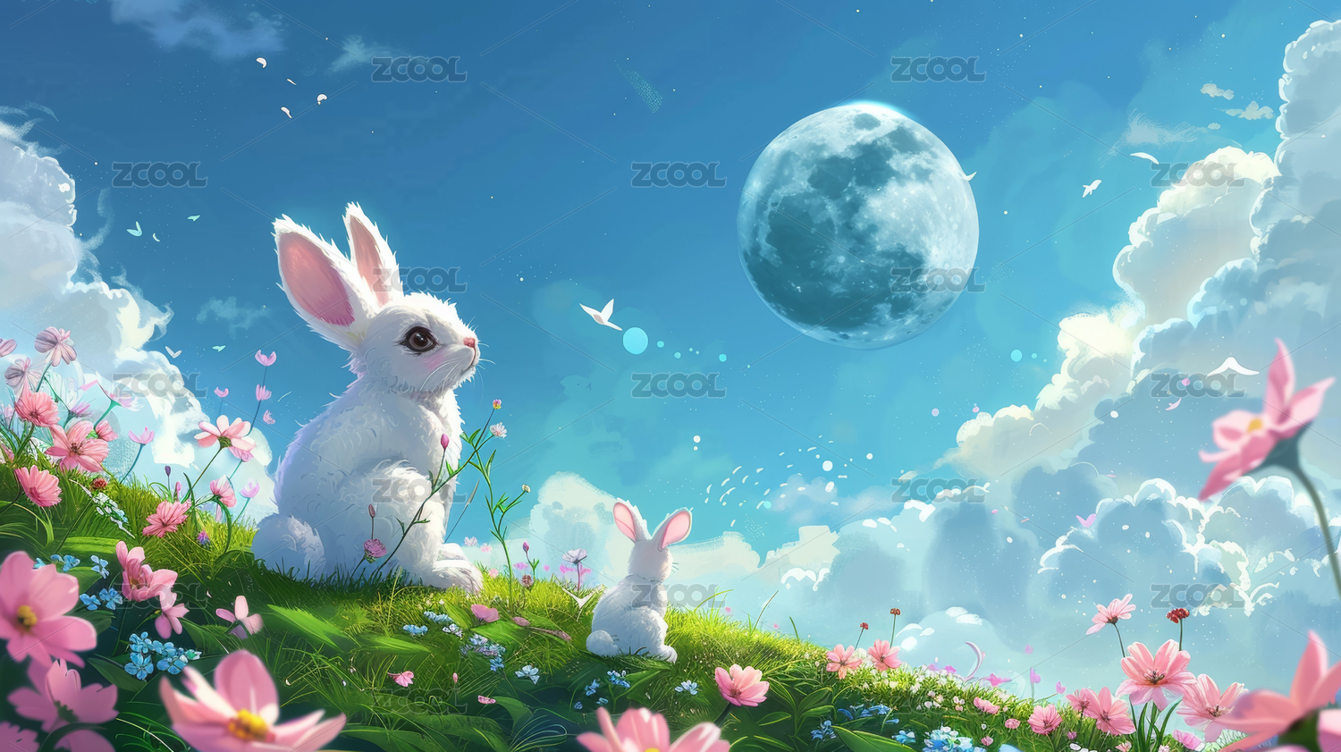 一只兔子在夜晚的山坡上望向月亮的插画背景