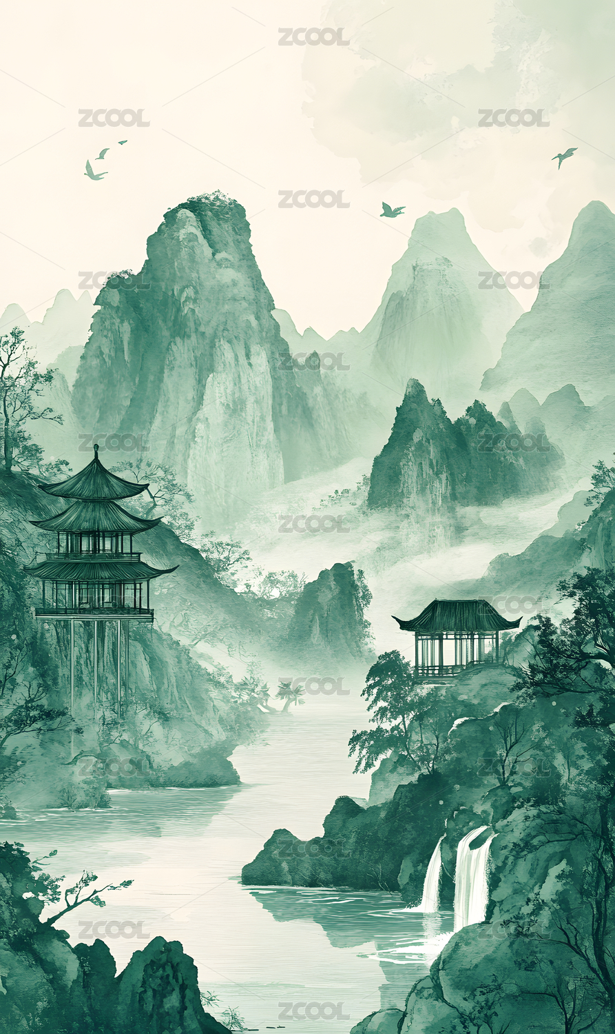 绿色山水祥云插画海报背景