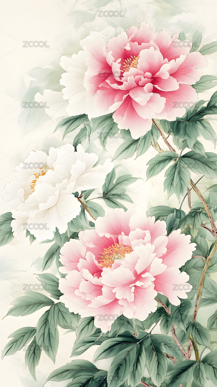牡丹,花卉,花朵,红色,白色,蓝色,花瓣,花蕊,中国画,绘画