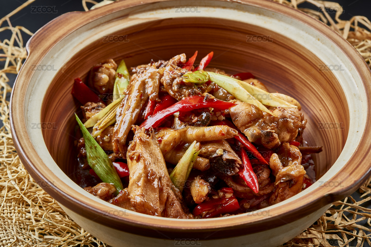 黑色背景上的砂锅酱香鸡块煲