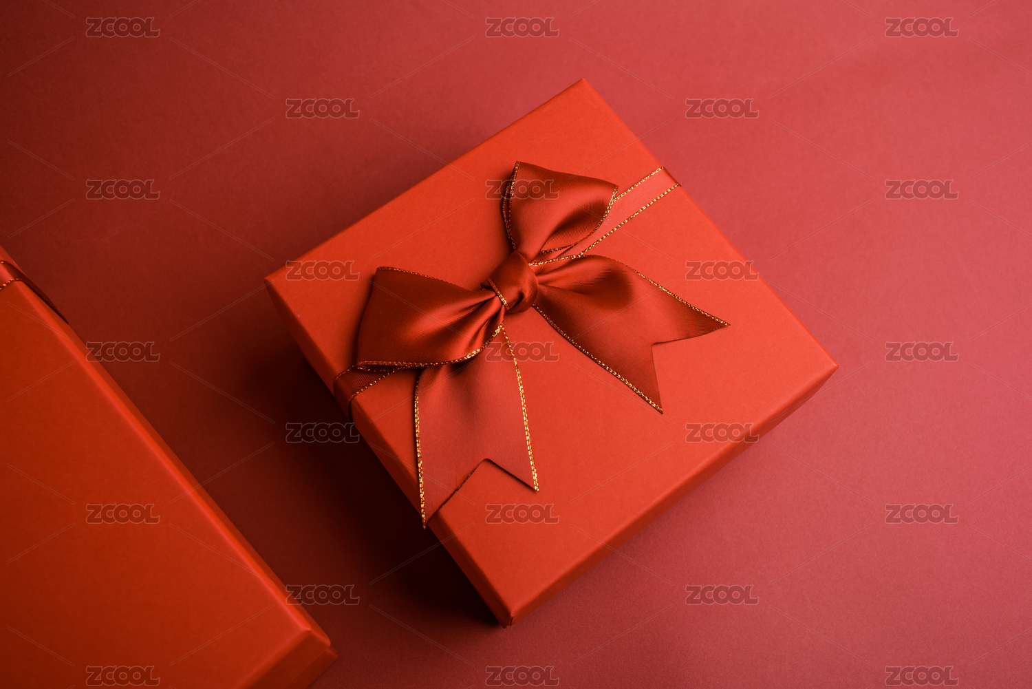 放在红色背景的绑着香槟色带子的红色礼物盒局部