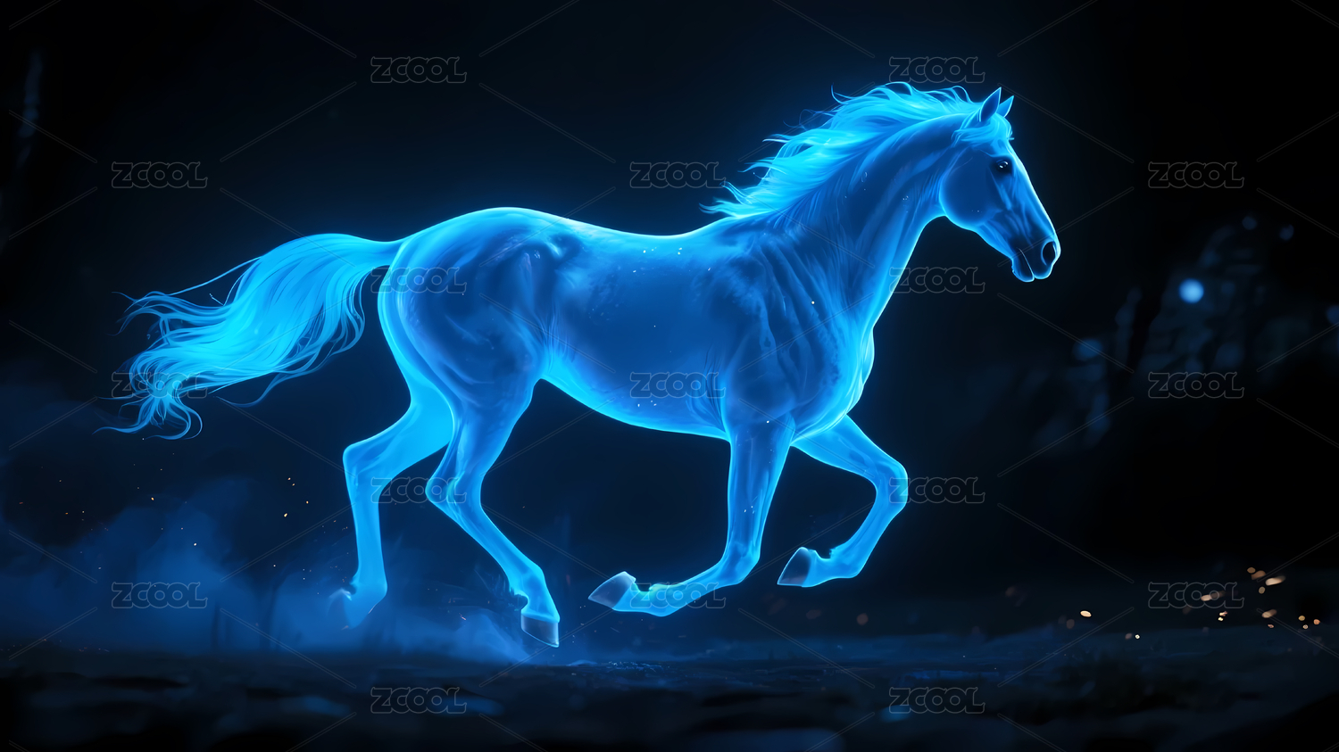 蓝色光影中的奔跑骏马