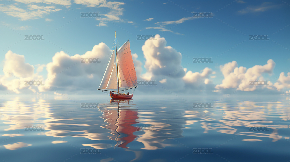 航拍视角下日落晚霞大海中航行的一艘帆船