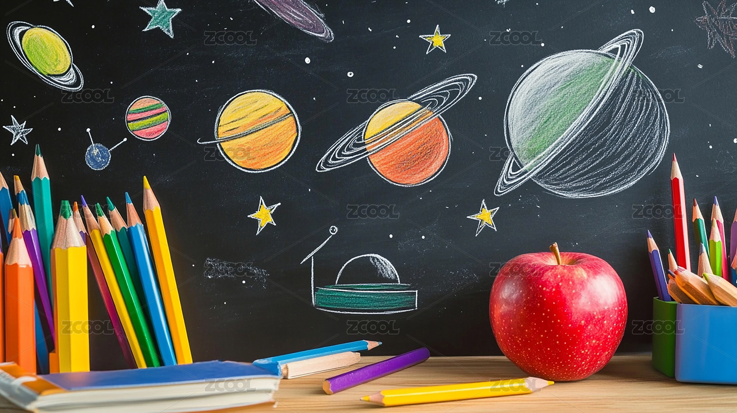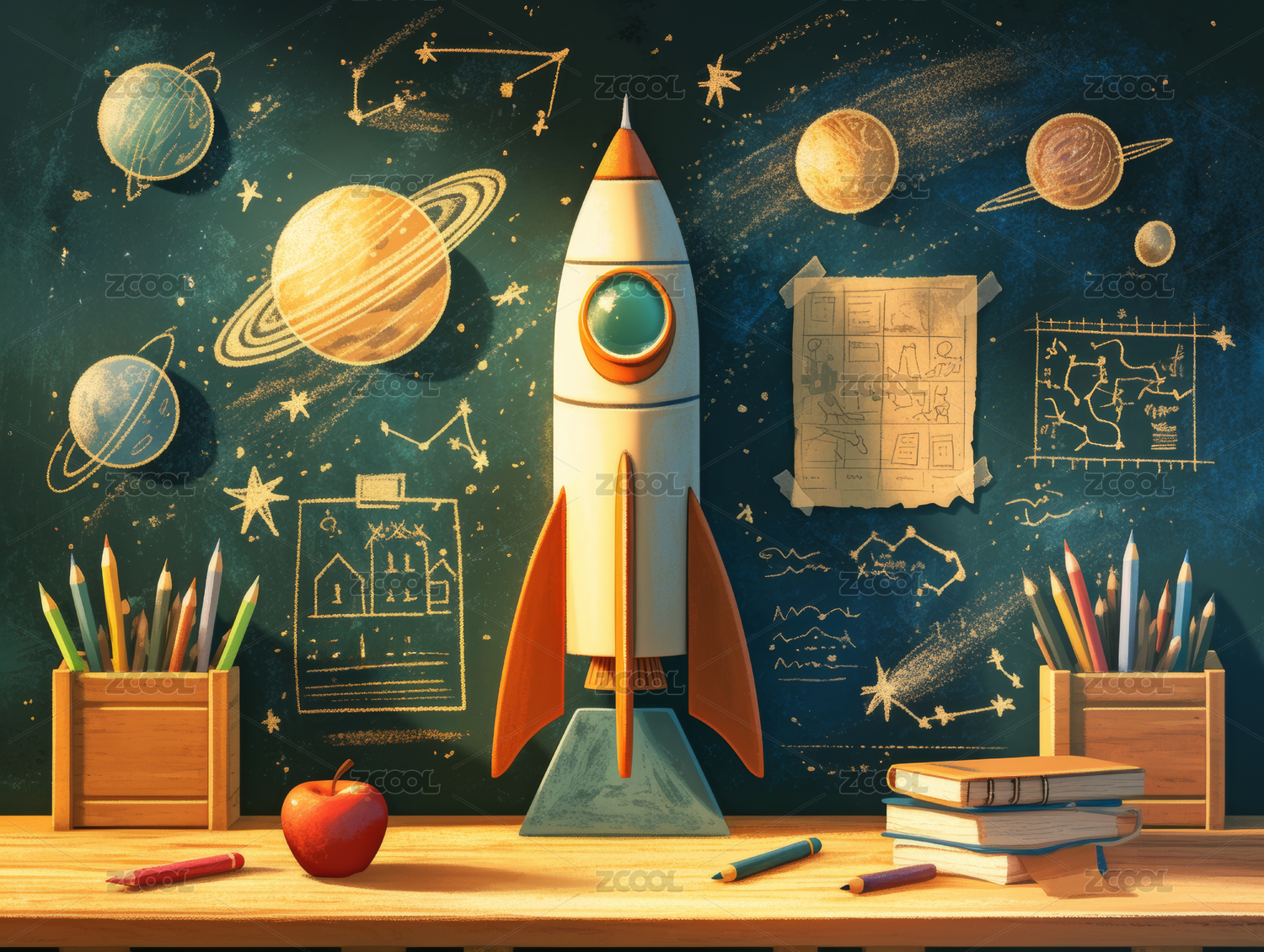 开学季创意场景宇宙飞船学校课桌黑板