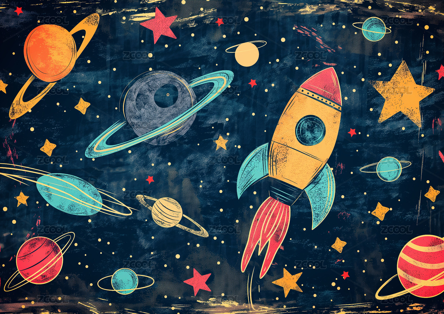 多彩的太空主题粉笔画展示星星和火箭