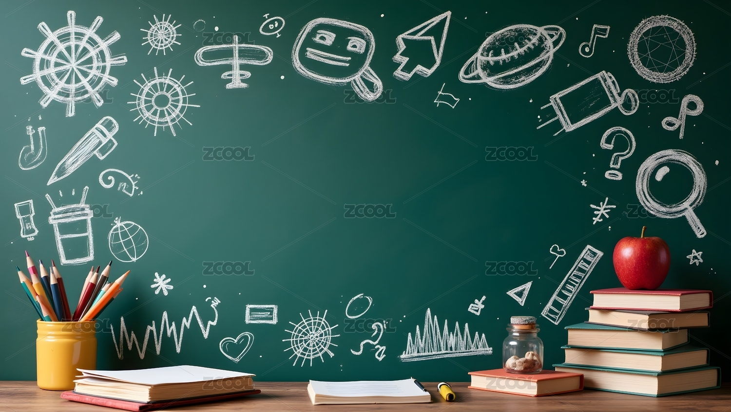 涂鸦黑板与散落书本插画背景