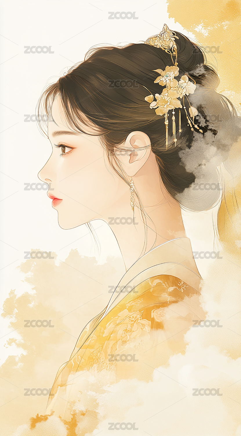 黄色服饰的古风盘发美女插画