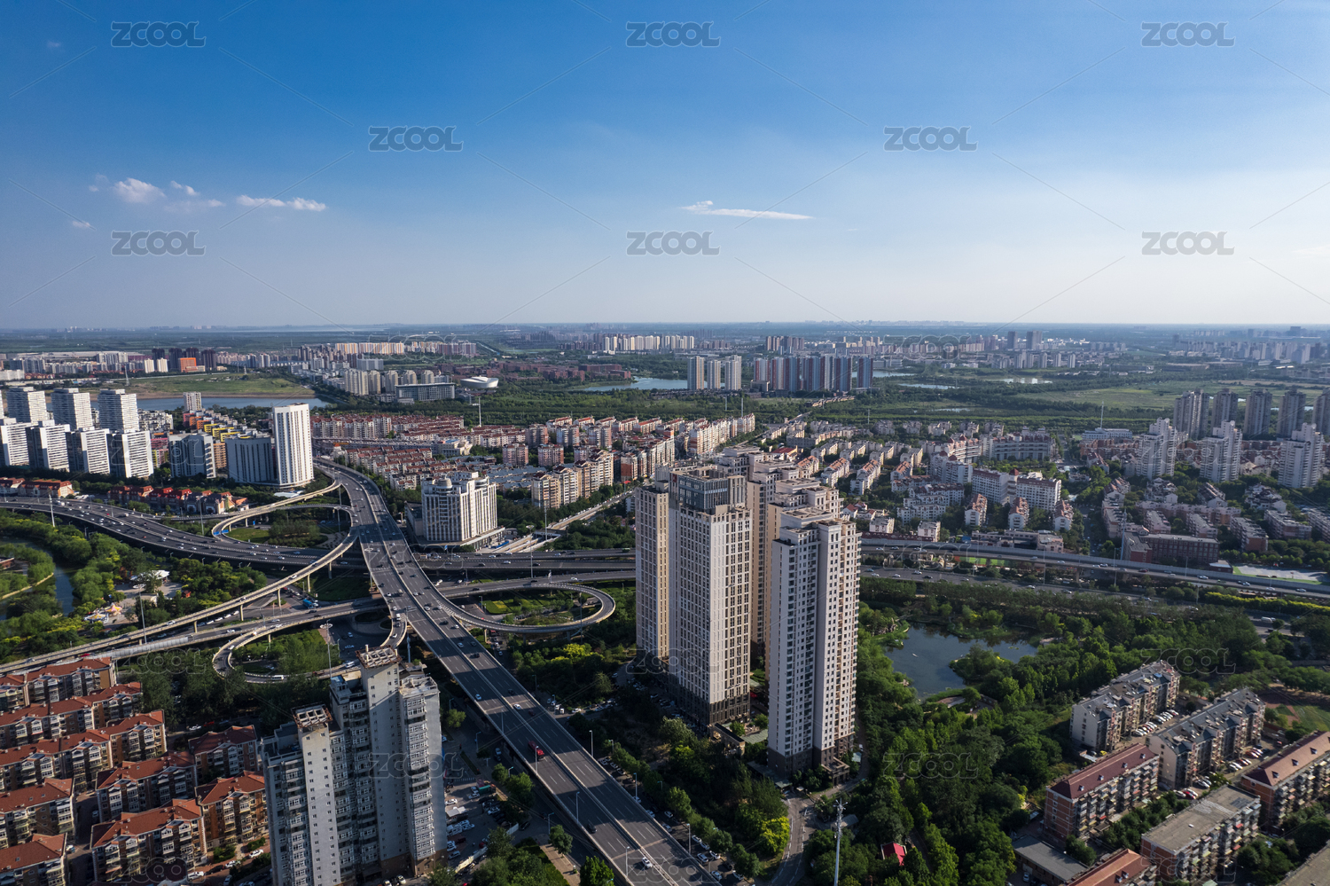 中国天津大港临潮湖岸边的建筑群航拍俯视图