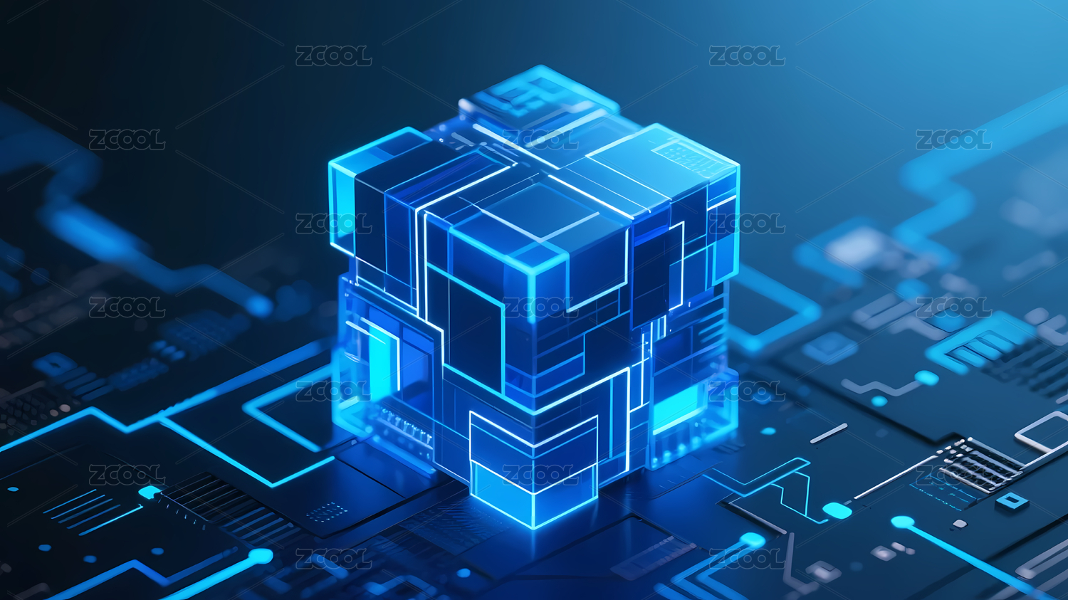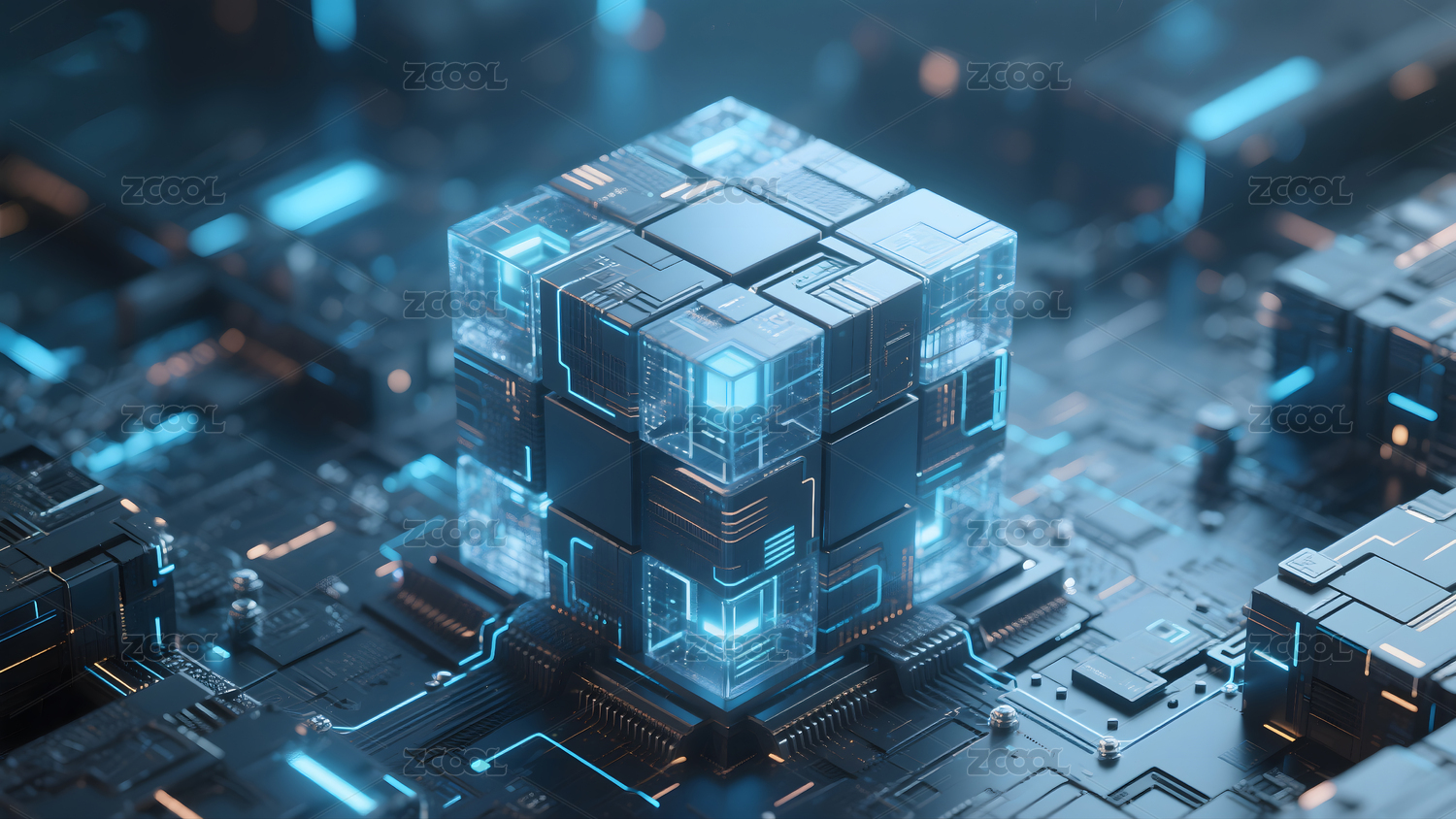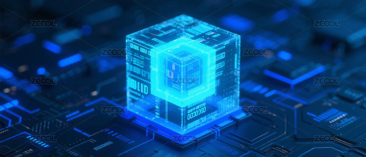 蓝色透明立方体与电路板