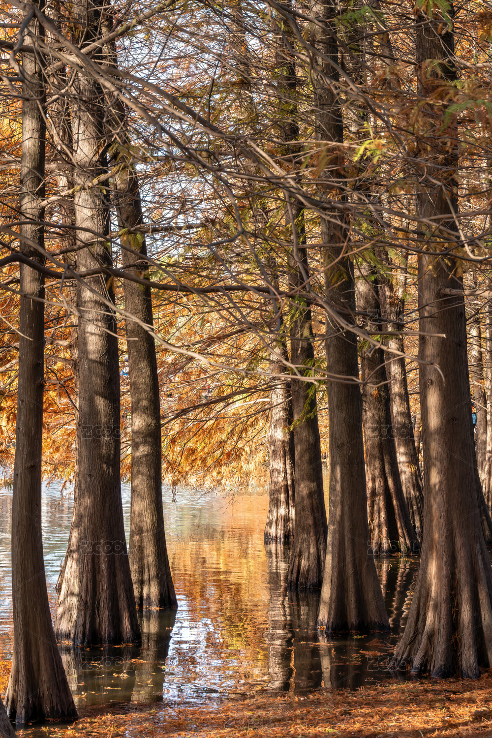 水杉,秋景,倒影,湖泊,树林,金色,落叶,水面,宁静,树木