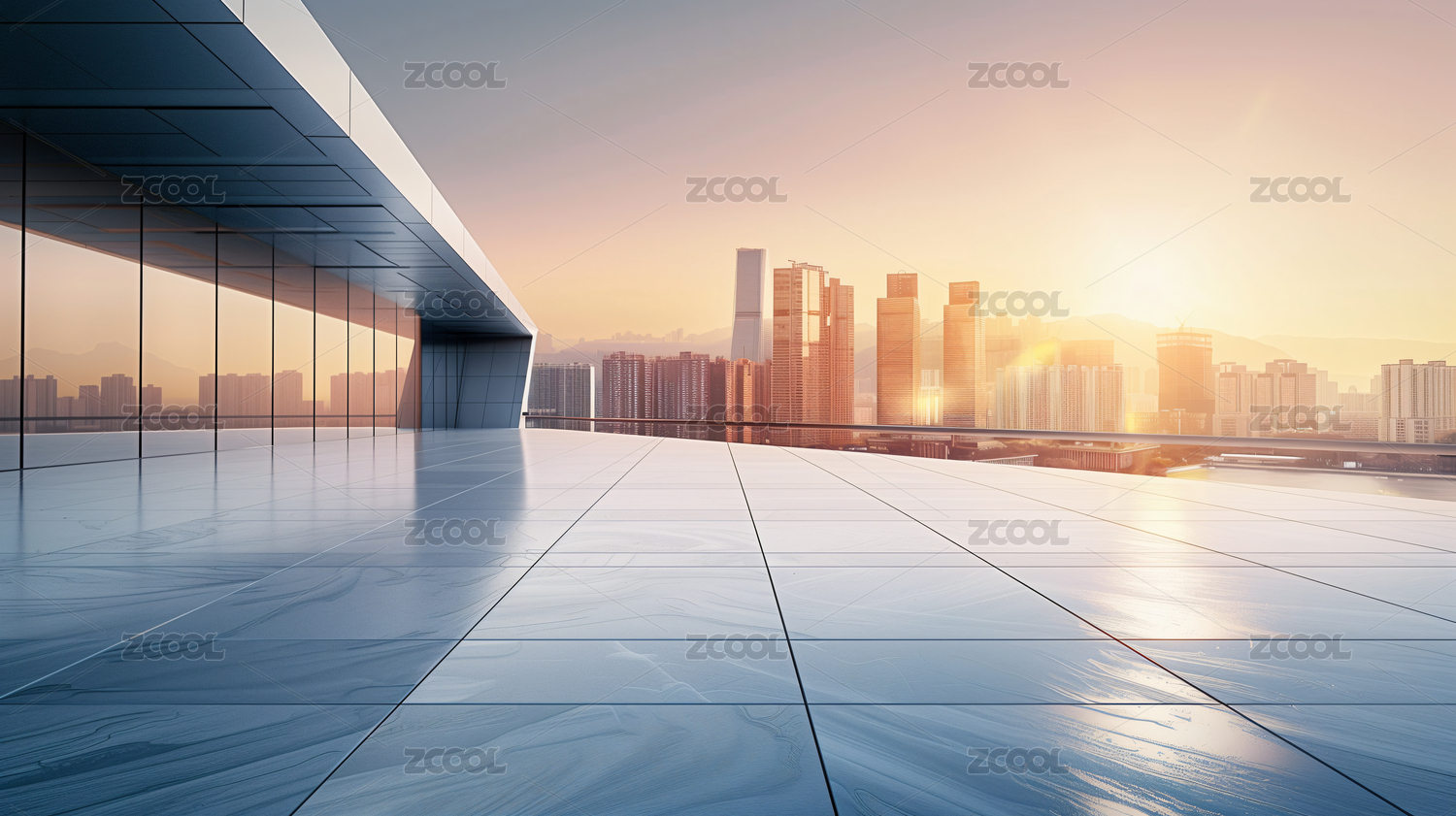 日落映衬的玻璃建筑空间
