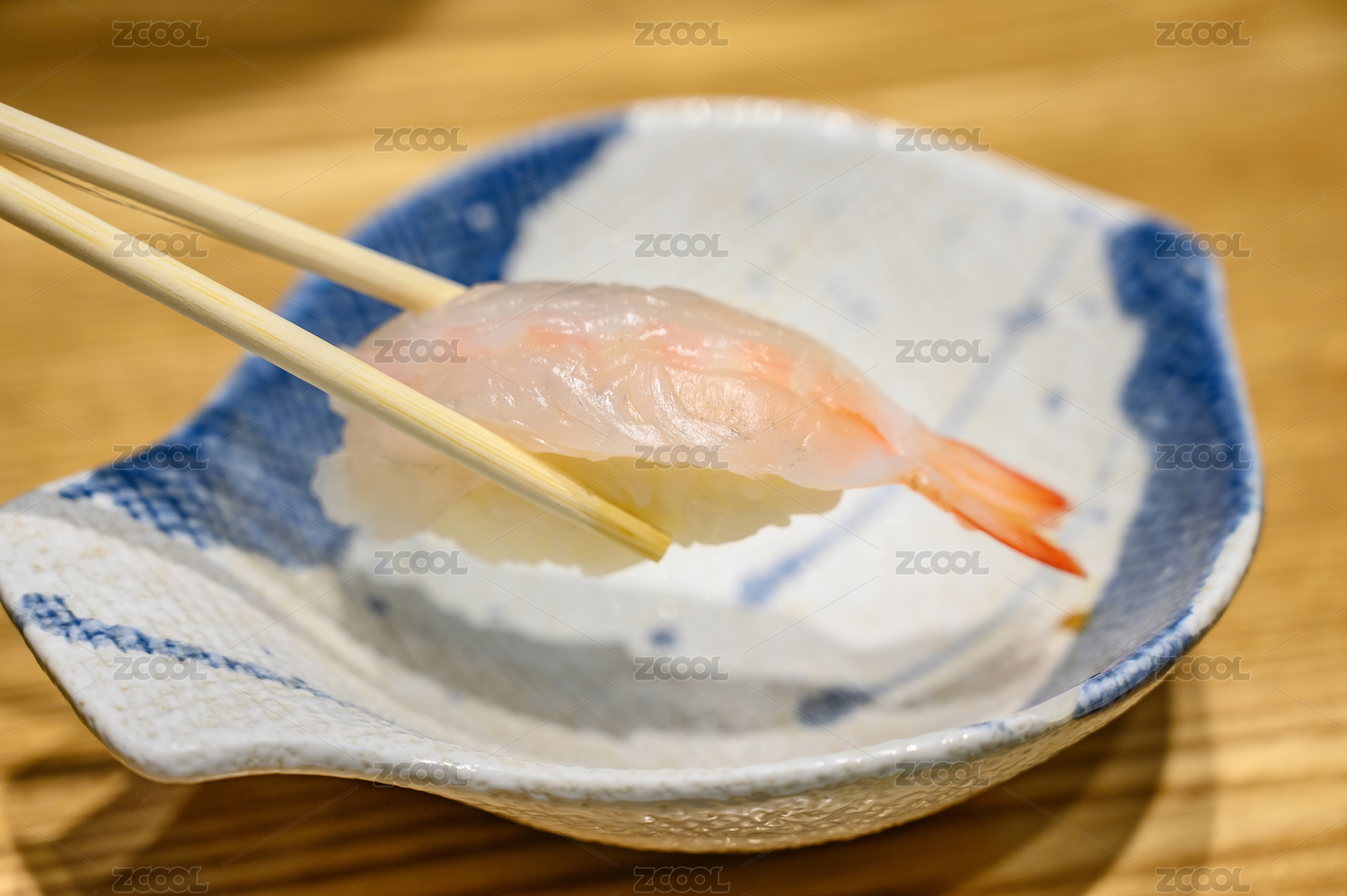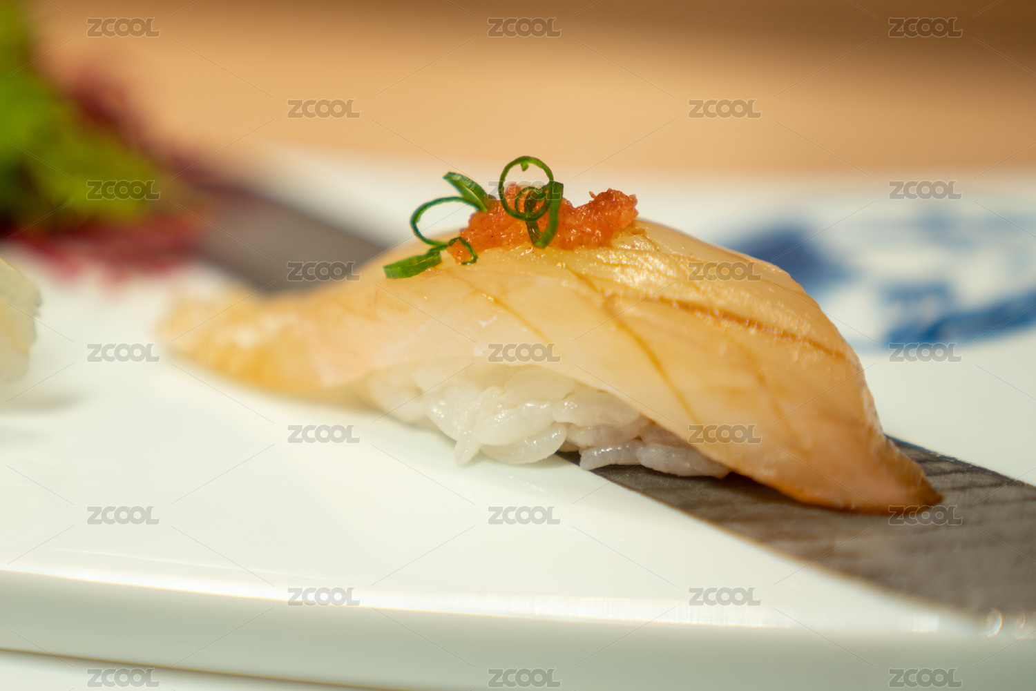 做好的鲷鱼寿司放在青花瓷盘上