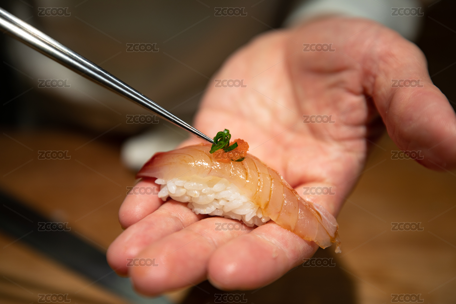 厨师手上正在制作一个鲷鱼寿司