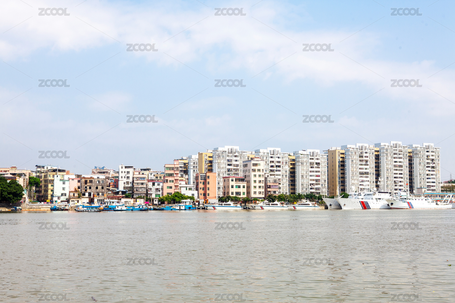 中国广东省珠海市沿海的现代城市建筑和海上交通贸易