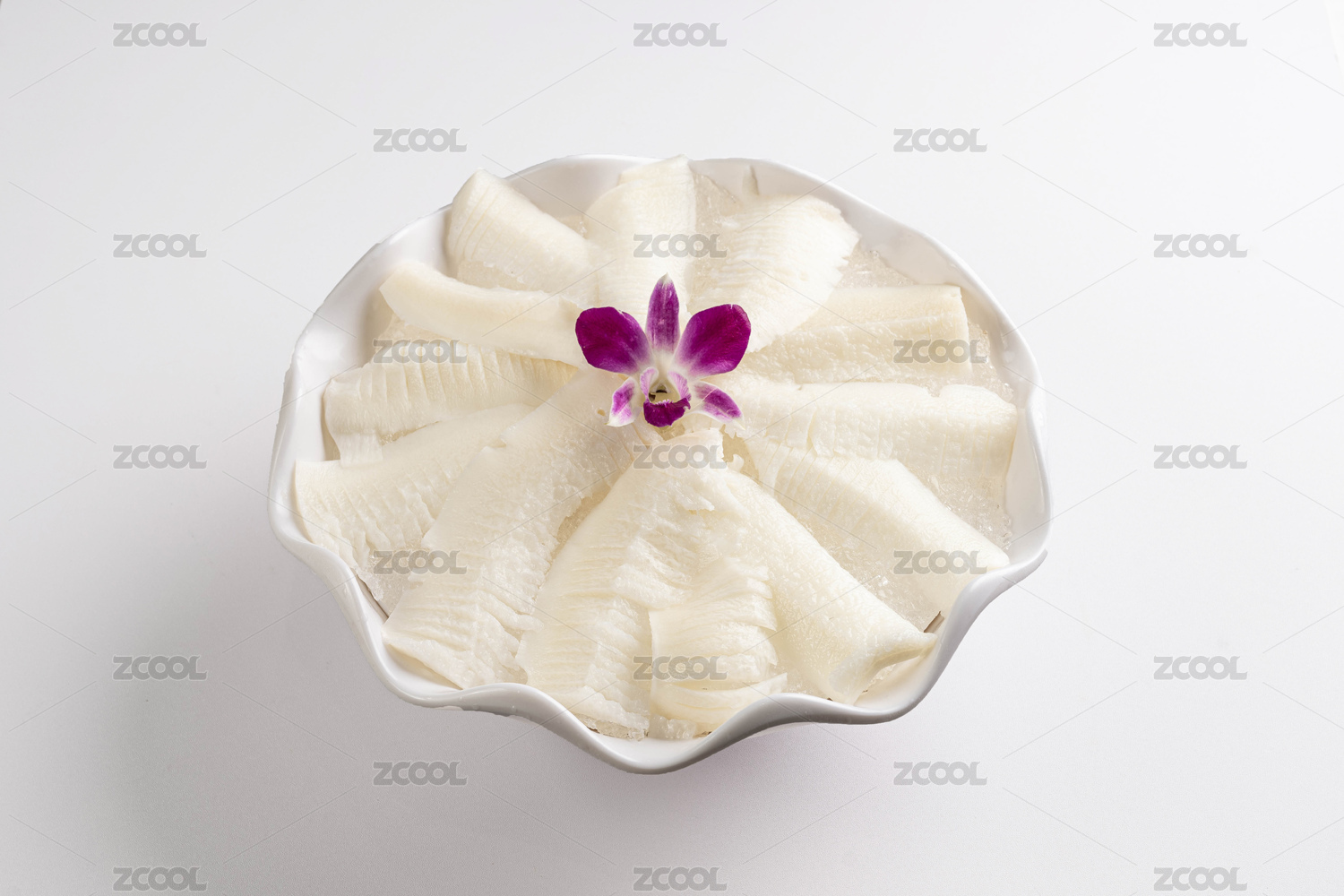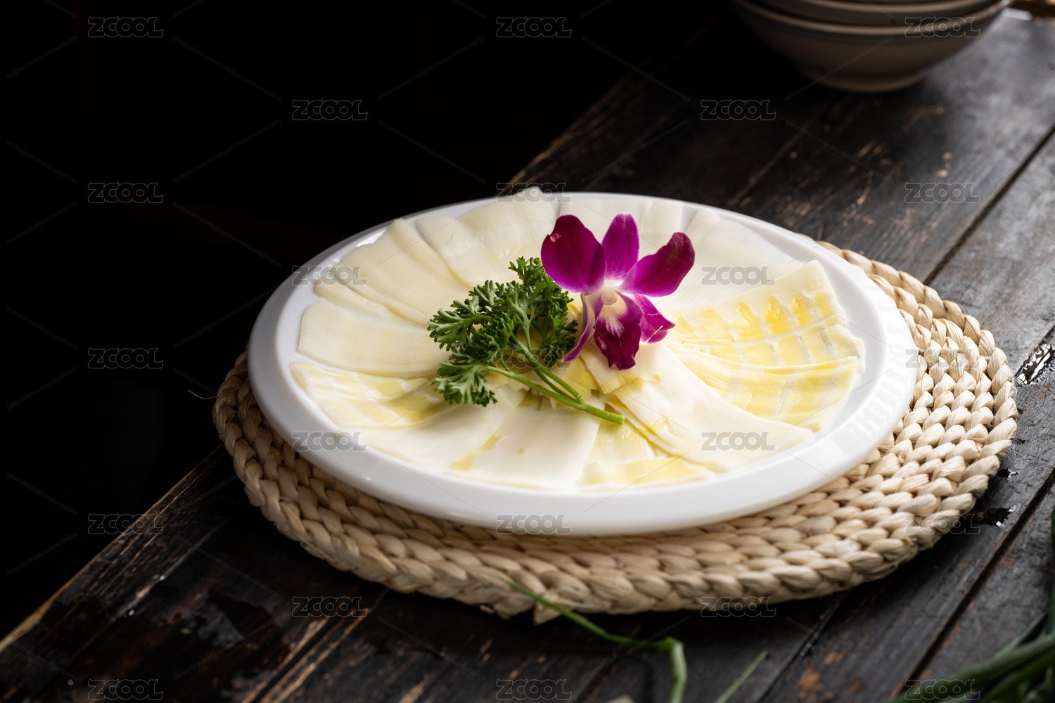 木桌上扇形盘里的重庆火锅菜品竹笋片