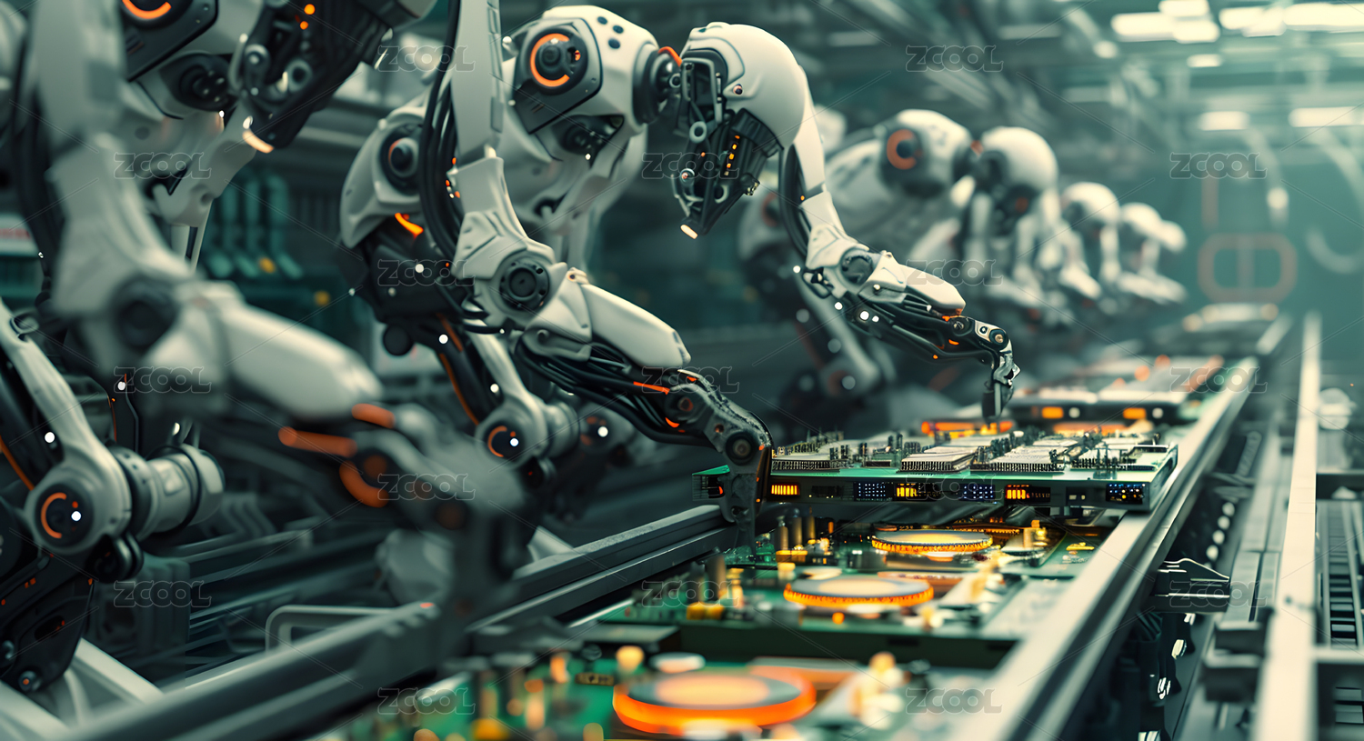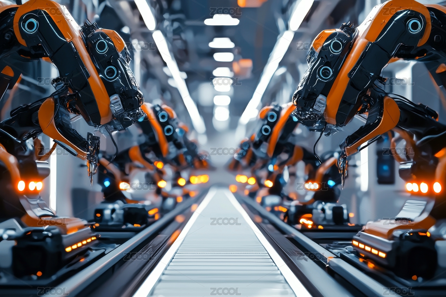 未来工厂车间里机器人工作装配线场景