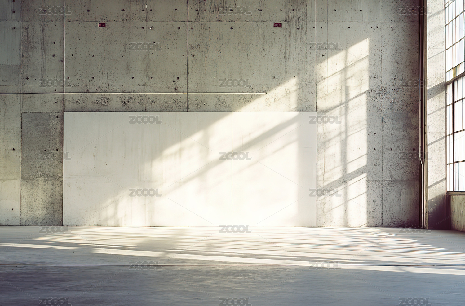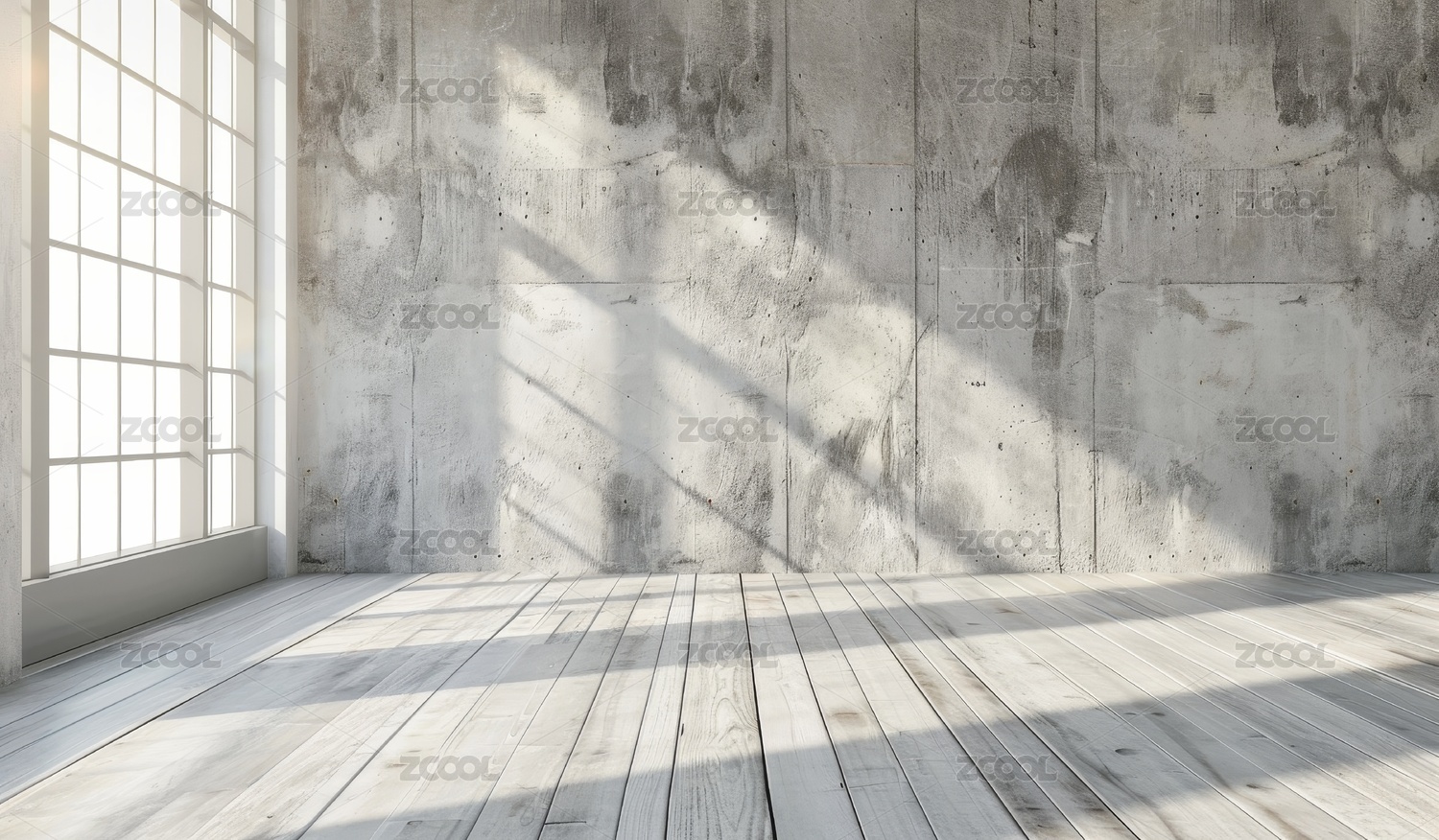 阳光透过窗户洒在混凝土墙上的室内场景