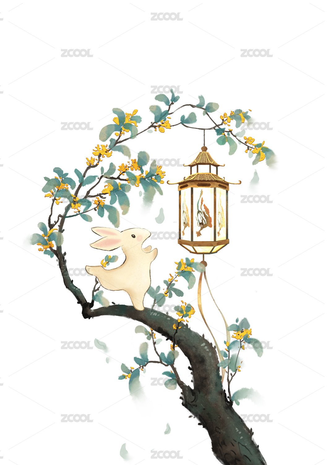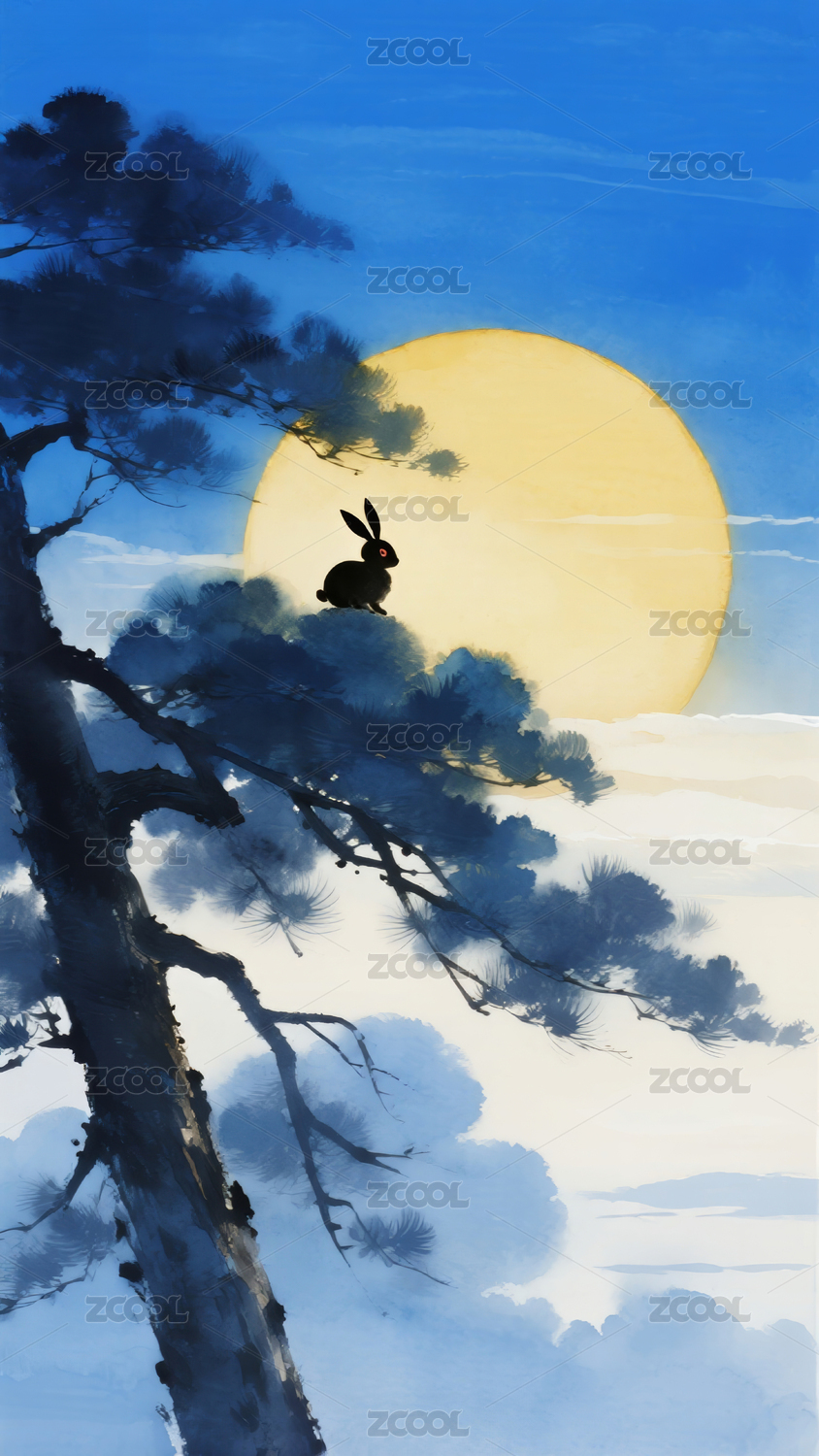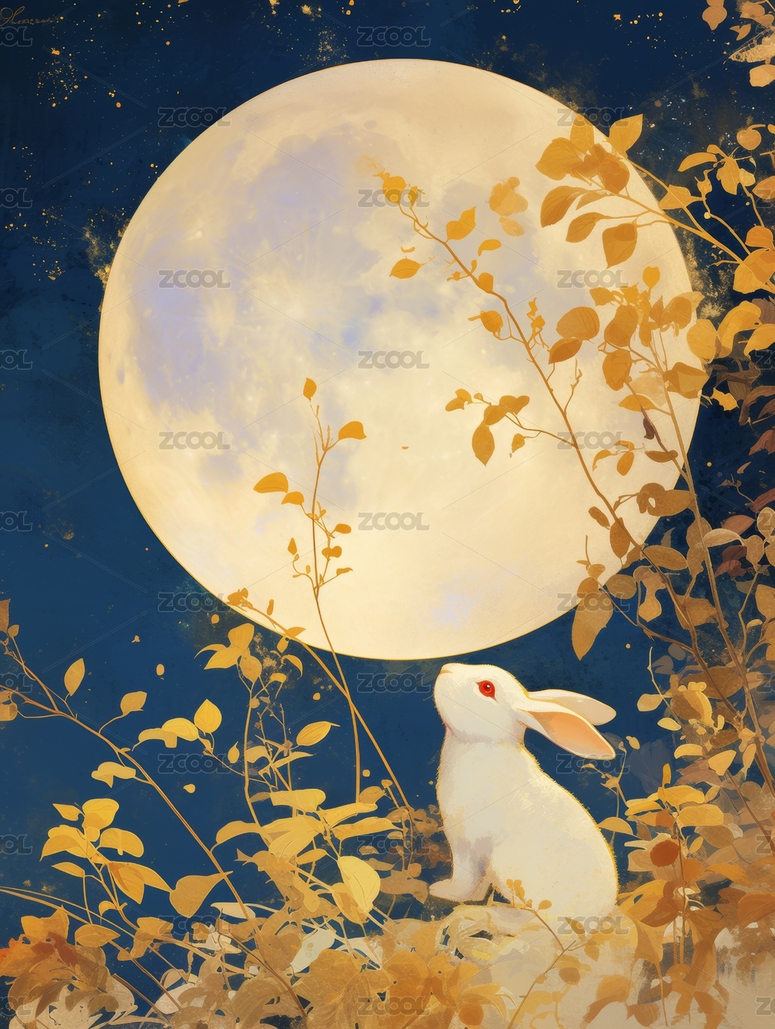 中秋圆月黄金月桂,嫦娥奔月,兔子剪影插画