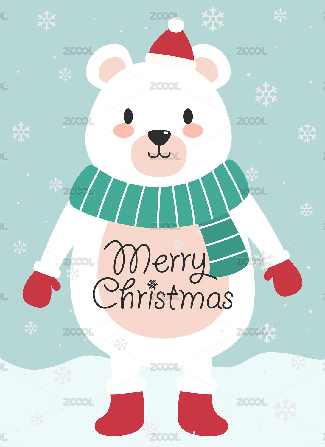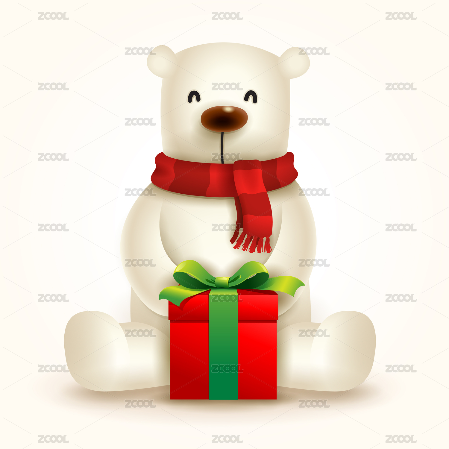 圣诞北极熊与红领巾。圣诞可爱的动物卡通人物。