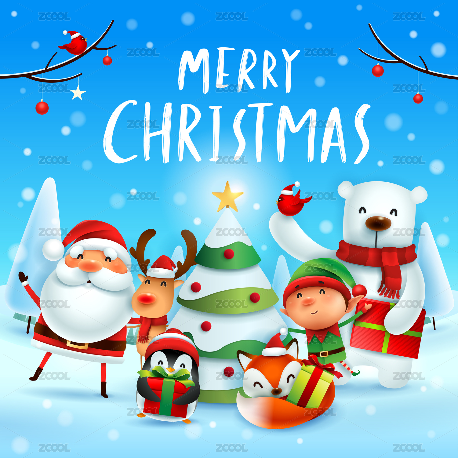 圣诞快乐相伴。圣诞老人,雪人,驯鹿和精灵在圣诞雪景。