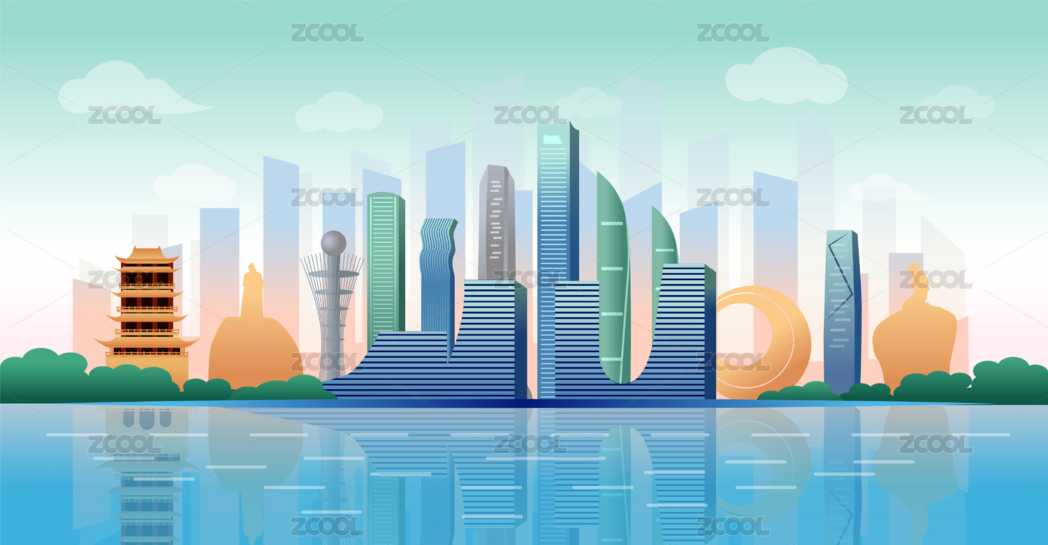 中国浙江绍兴市商务科技城市彩色矢量插画