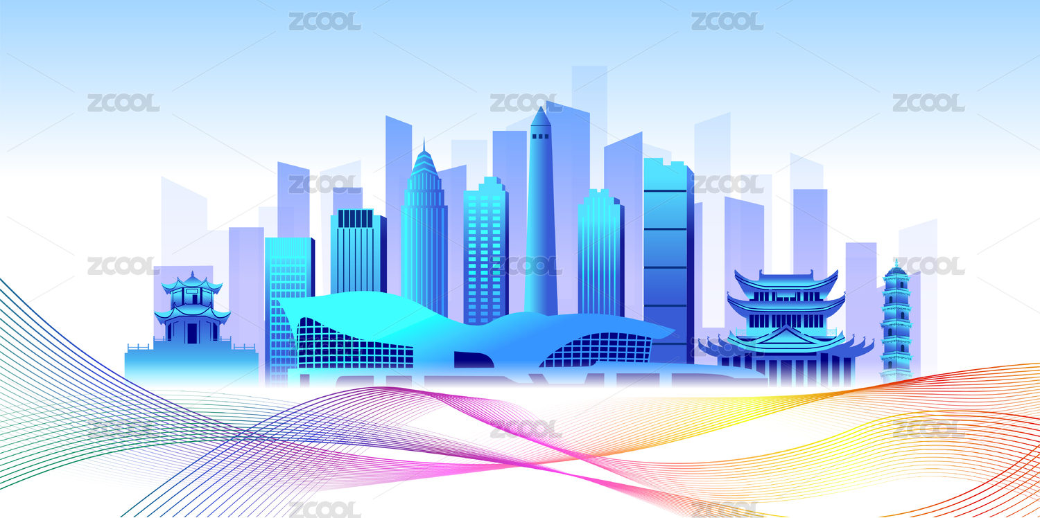 中国浙江省宁波市商务科技城市彩色矢量插画