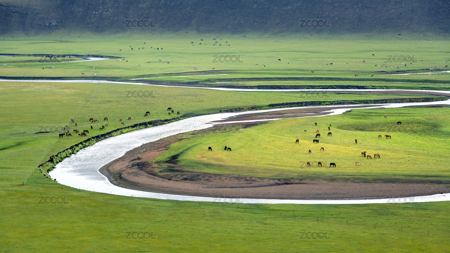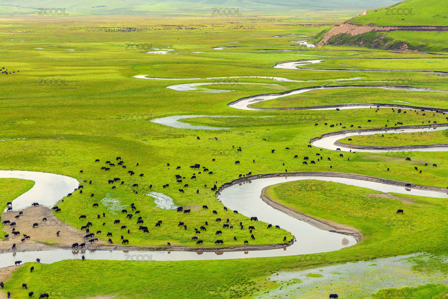 草原上崎岖蜿蜒的蓝色河流,牛羊吃草