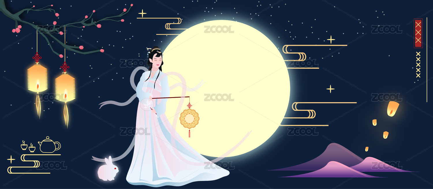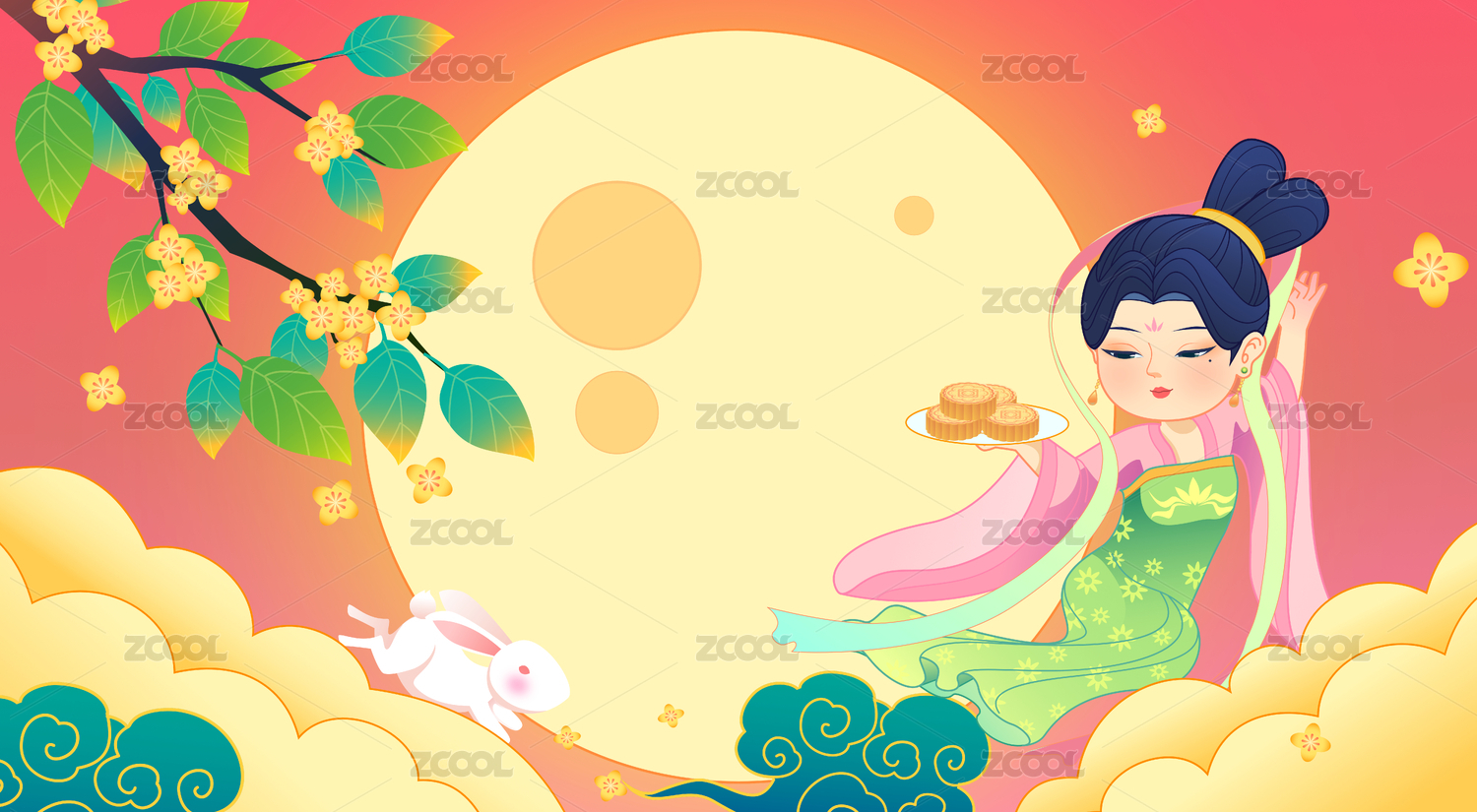 中秋节嫦娥兔子桂花月亮等国潮风插画海报