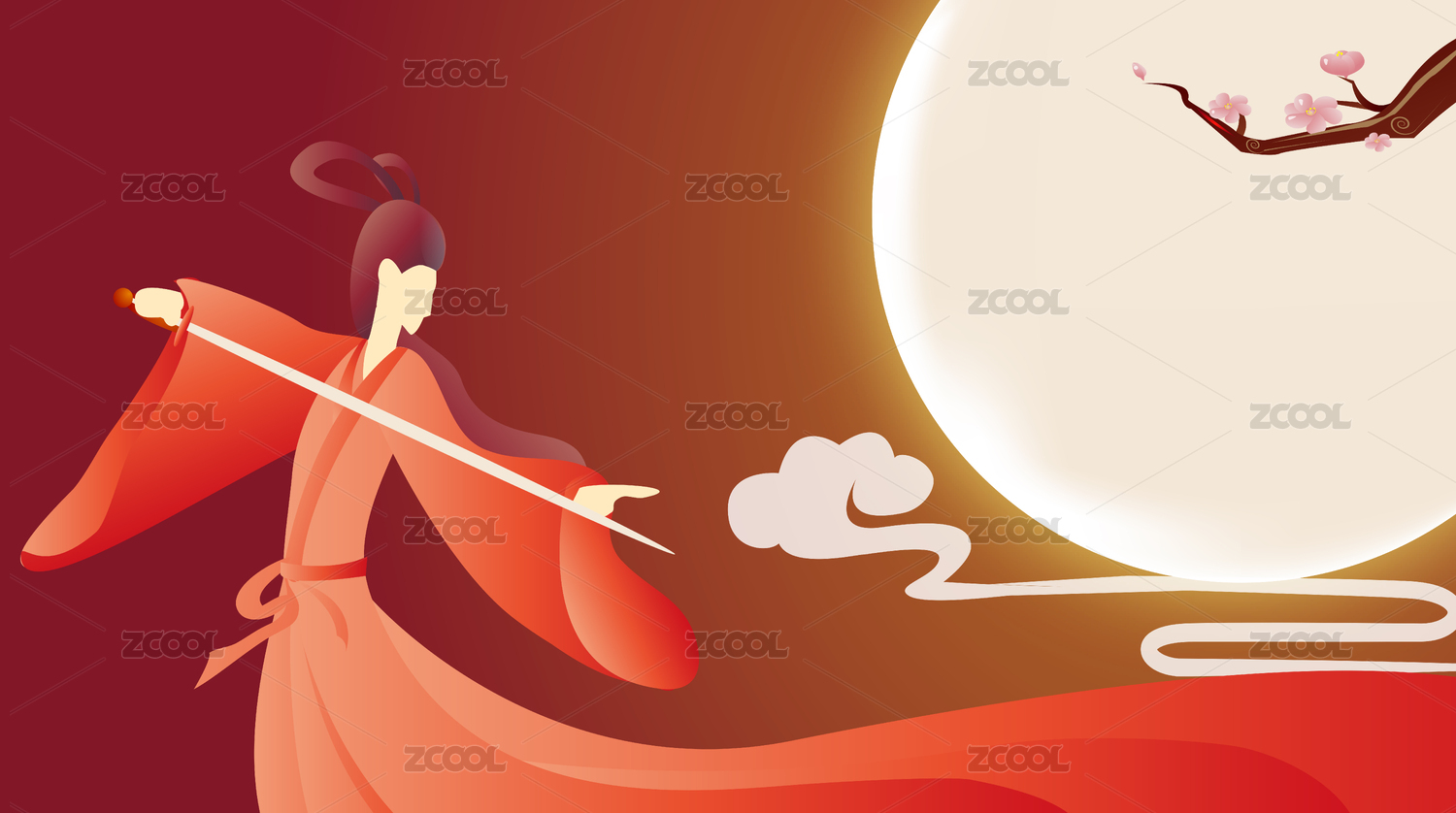 月圆之夜红衣仙女舞动宝宝剑的矢量插画