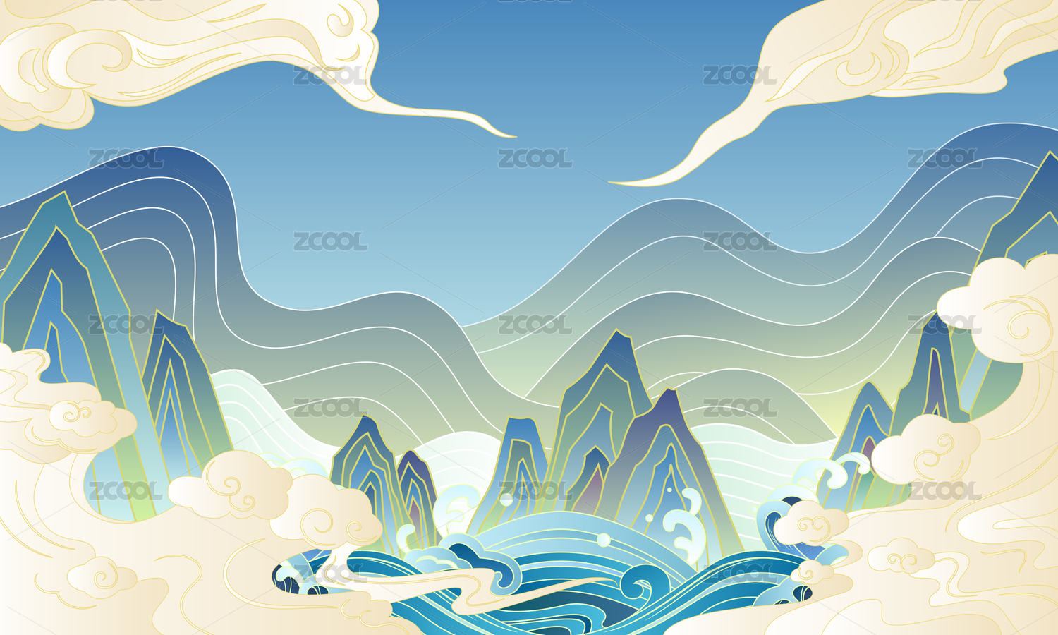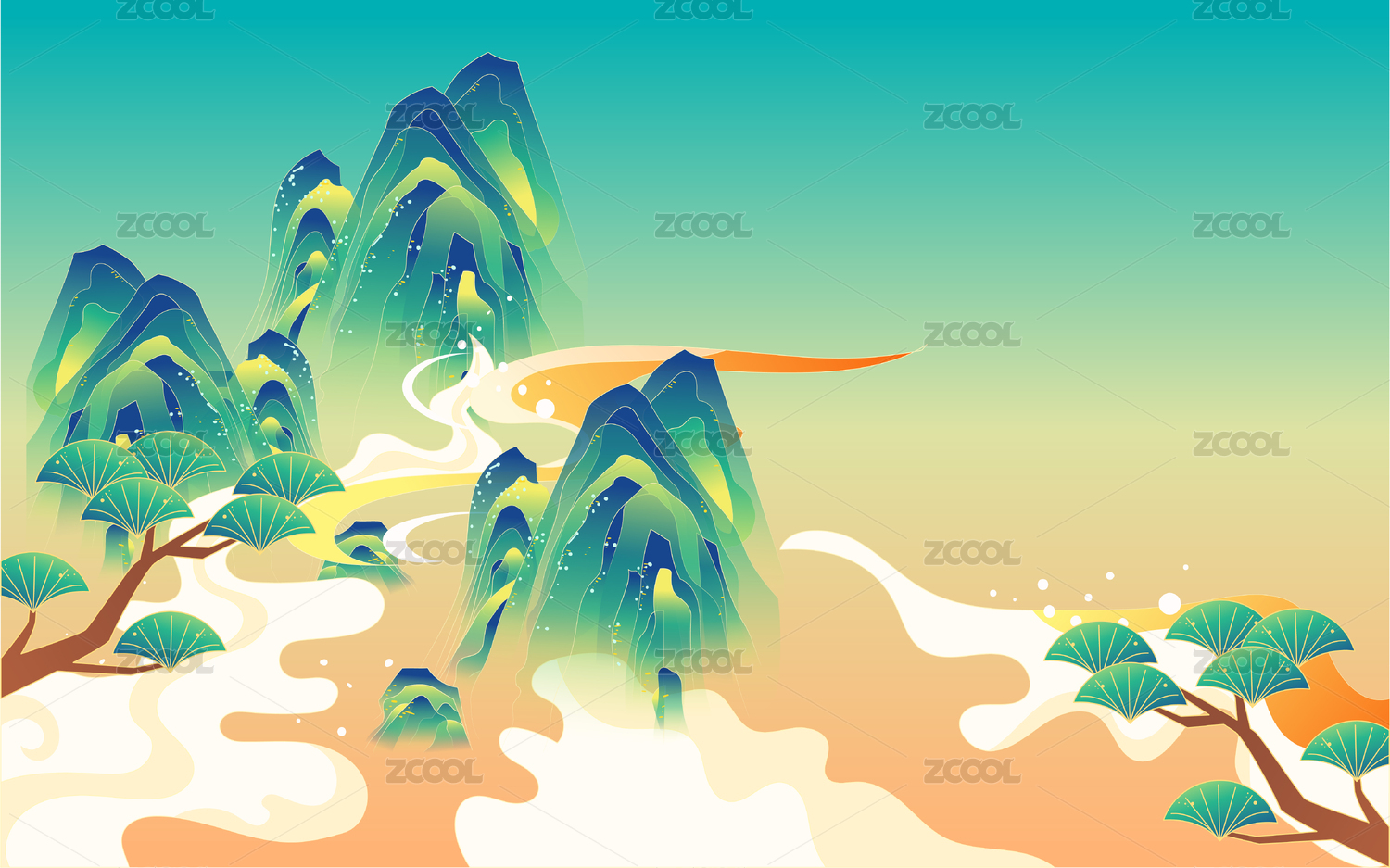 汹涌,波涛,山势,迎客松,险峰,险峻,两岸,山水,山水画,卡通