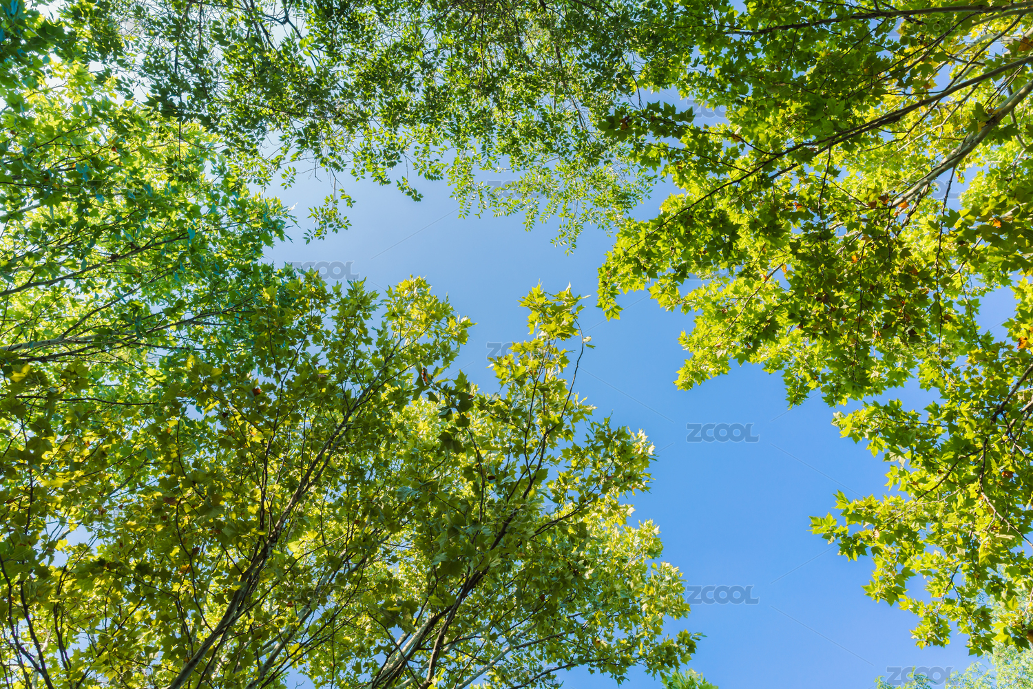 茂密的树林仰望展湛蓝的天空白云朵朵