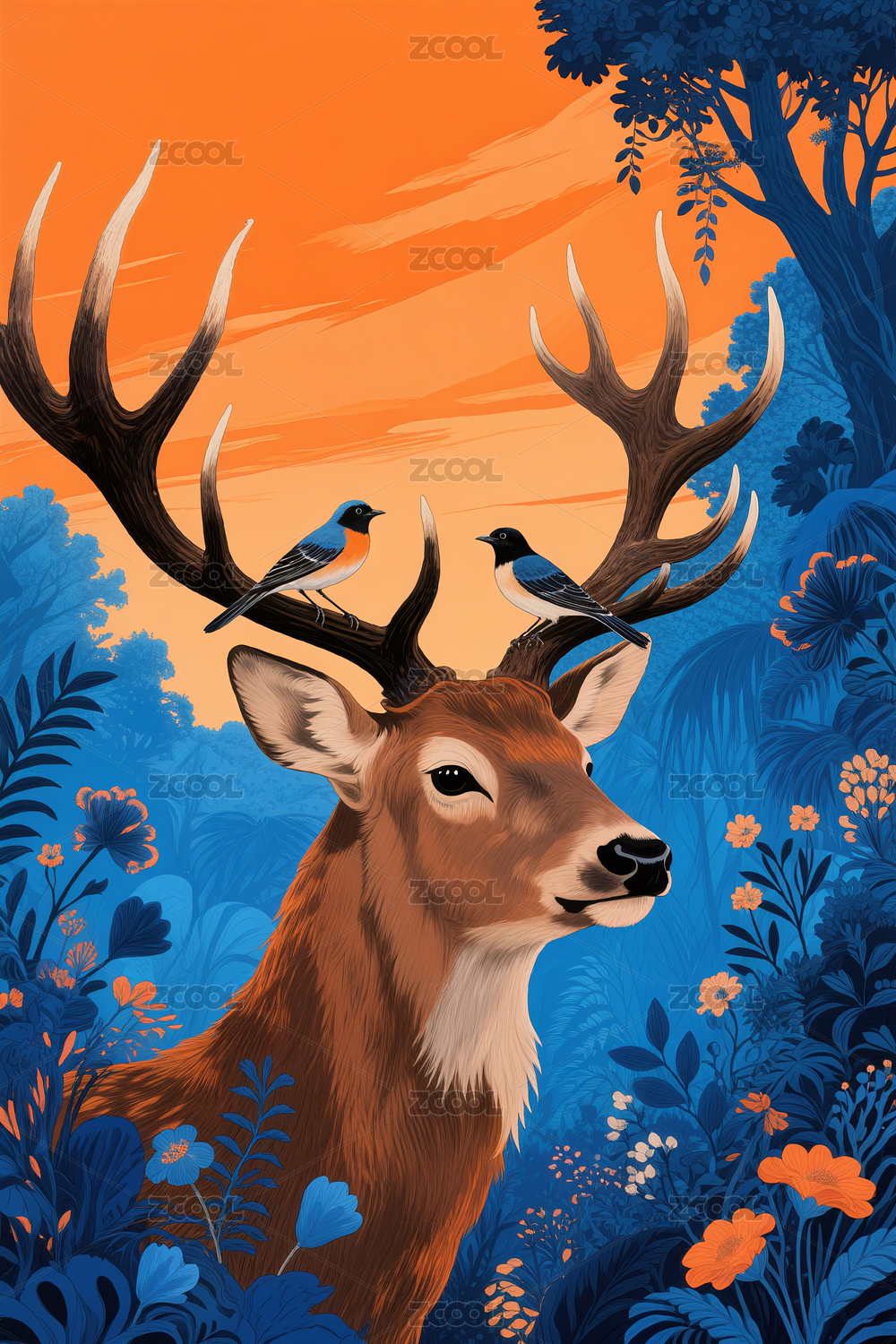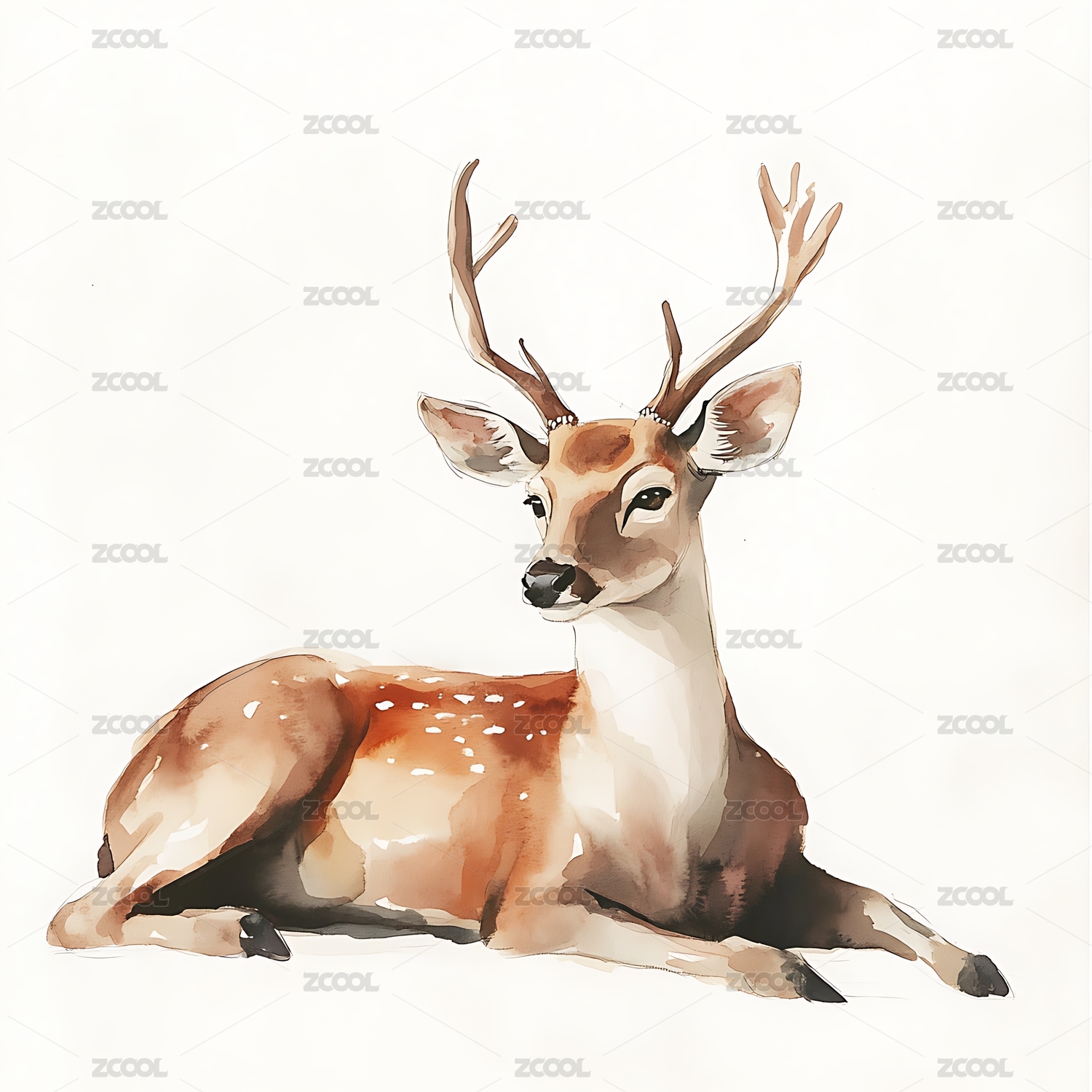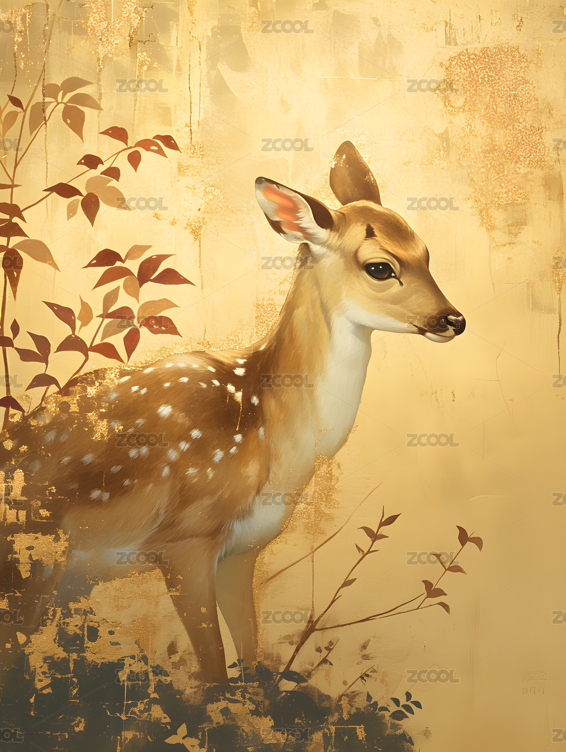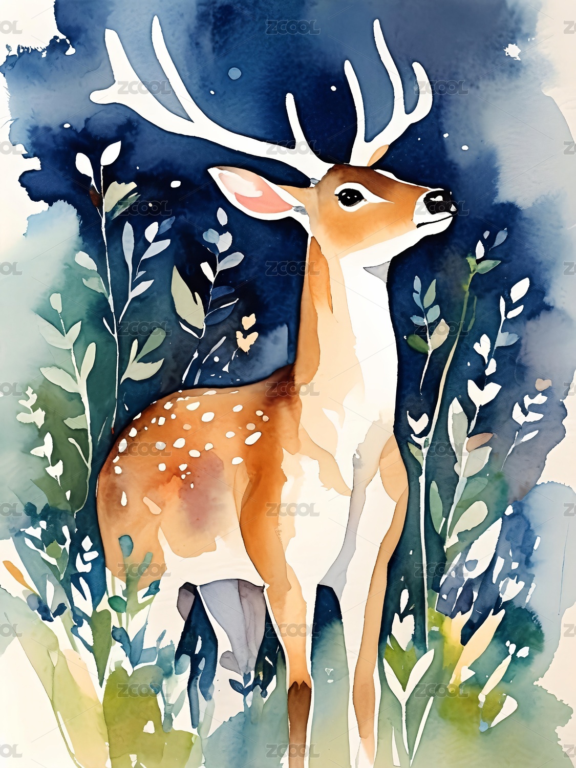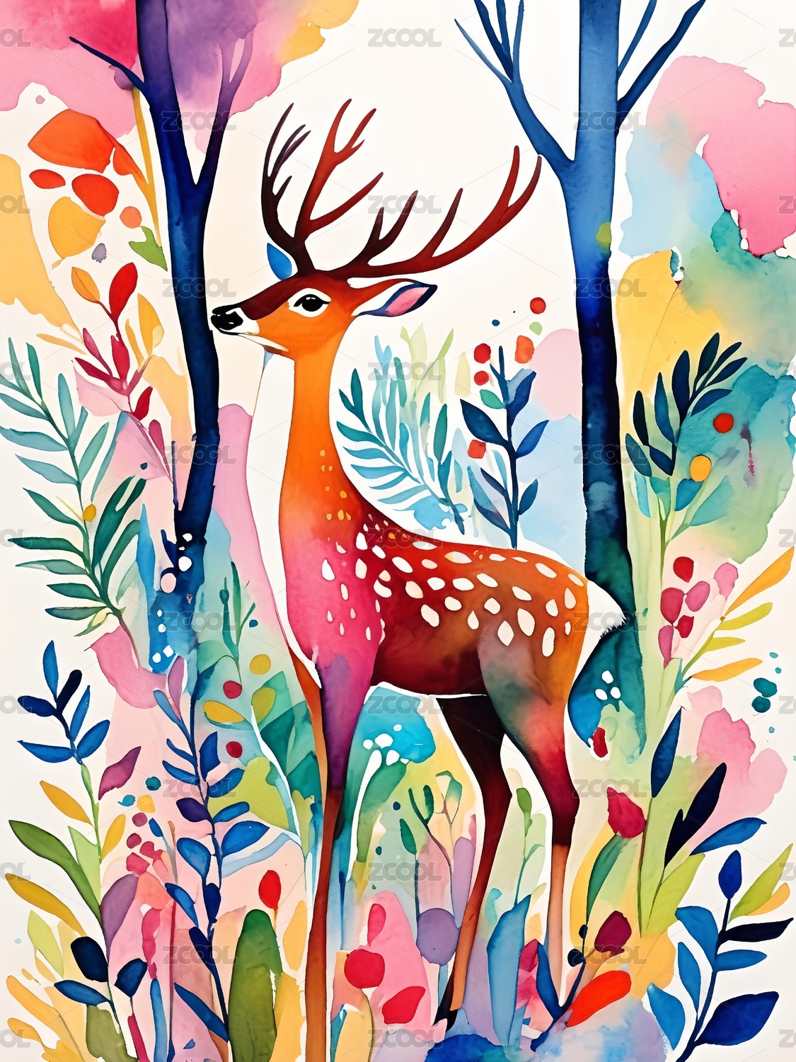 梅花鹿,鹿,灵动,站立,角,优雅,草,树,水彩,溅点