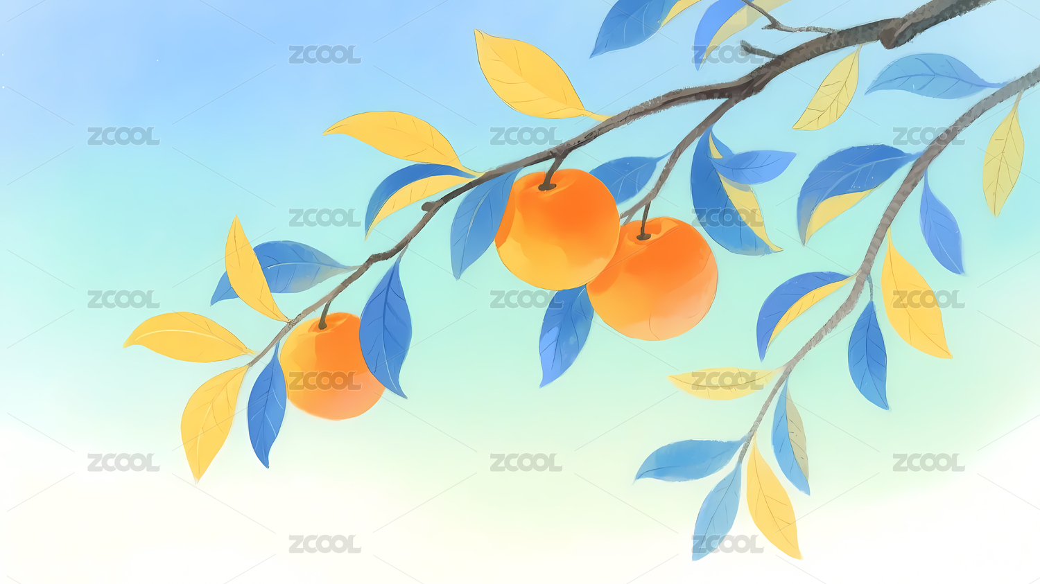 水彩风格长满成熟柿子的树枝