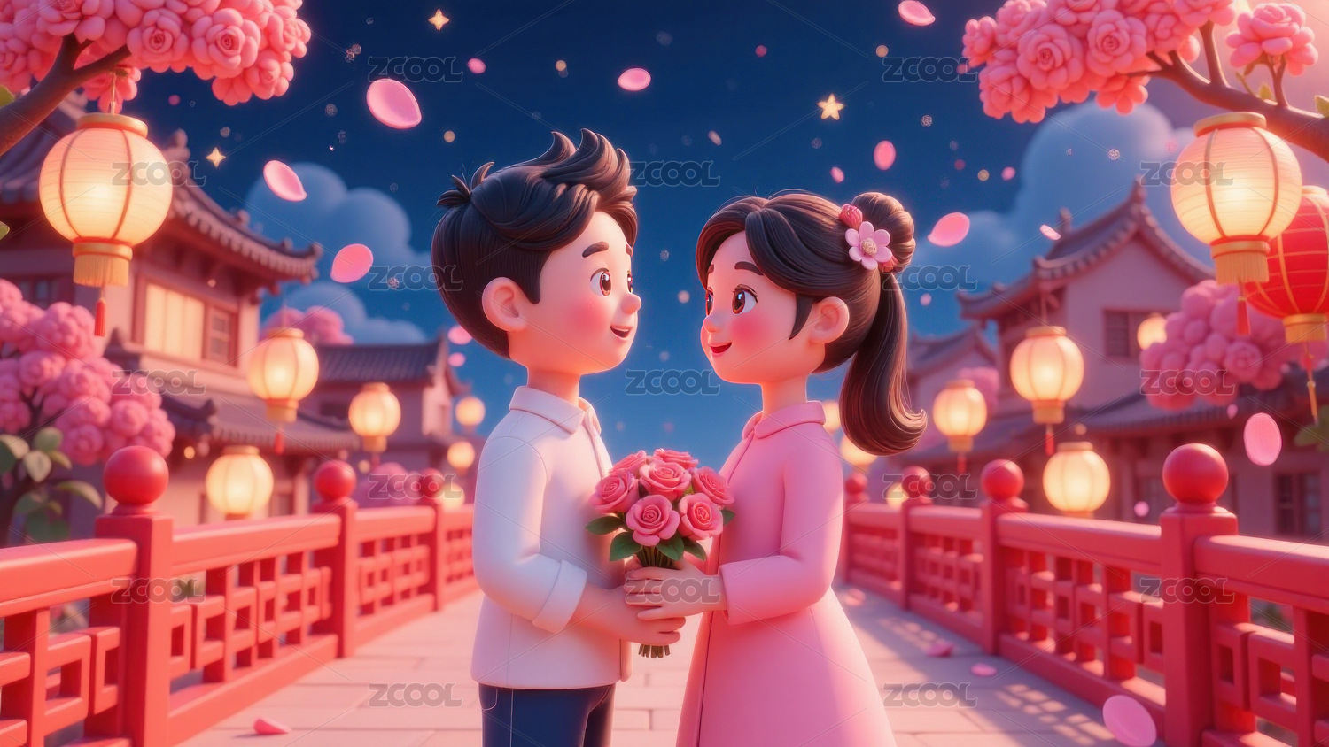七夕情人节的古代情侣三维渲染插画